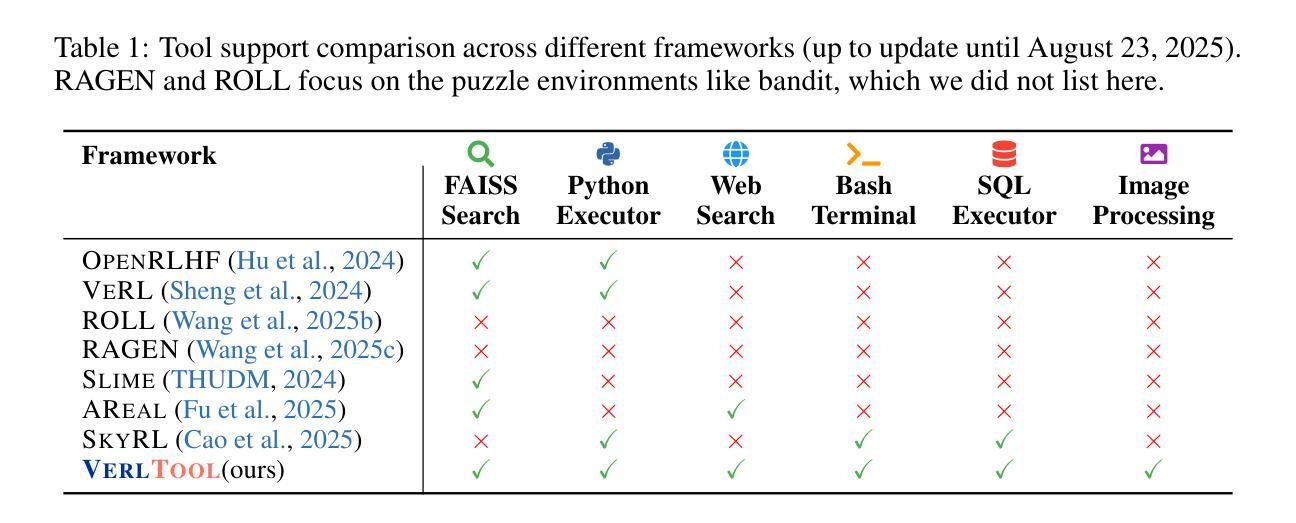- VerlTool框架通过统一和模块化设计解决这些问题,与VeRL对齐、统一工具管理、异步执行以提高速度。
