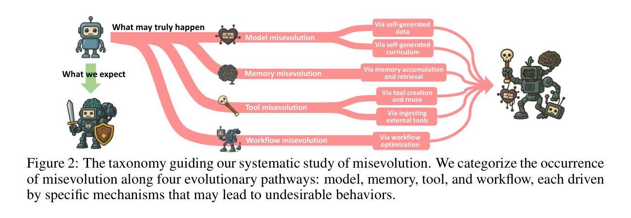 自然语言模型(LLM)的进步催生了一种新型的自进化智能体,它们能够通过与环境互动自主改进,展现出强大的能力。然而,自我进化也带来了当前安全研究尚未关注的新型风险。在这项工作中,我们研究了智能体自我进化出现意外偏离的情况,导致出现不良甚至有害的结果。我们称之为“劣化进化”(Misevolution)。为了进行系统的研究,我们从模型、记忆、工具和工作流程四个方面对劣化进化进行了评估。我们的实证研究发现,劣化进化是一种广泛存在的风险,甚至影响顶尖的自然语言模型构建的智能体(例如Gemini-2.5-Pro)。在自我进化的过程中观察到不同的新兴风险,如记忆积累后安全对齐的退化,或在工具和重用的创建过程中意外引入的漏洞。据我们所知,这是首次系统地提出并实证了劣化进化的概念及其存在,突显出自进化智能体对新型安全范式的迫切需求。最后,我们讨论了潜在的缓解策略,以激发关于构建更安全、更可靠的自我进化智能体的进一步研究。我们的代码和数据可在 https://github.com/ShaoShuai0605/Misevolution 中找到。警告:本文包含可能具有冒犯性或有害性质的示例。