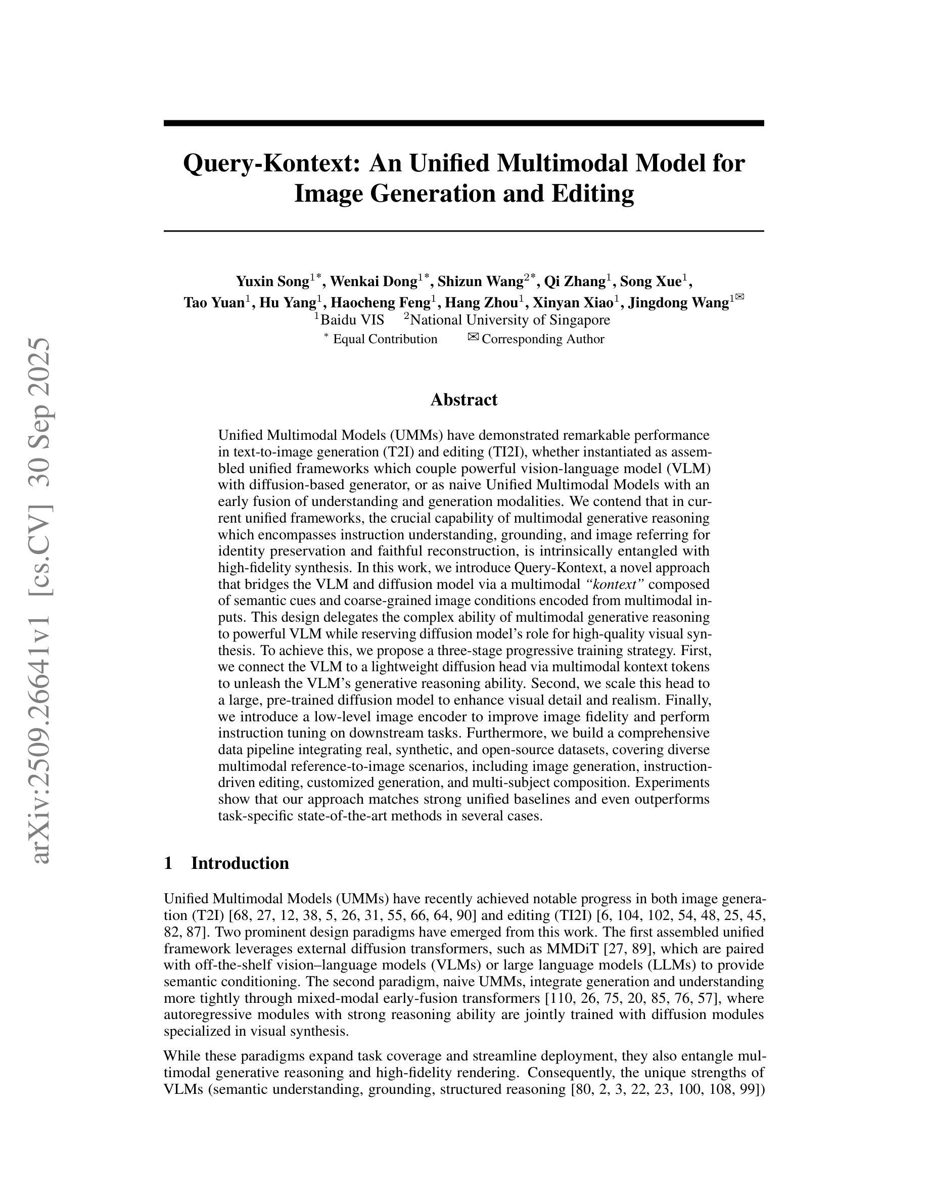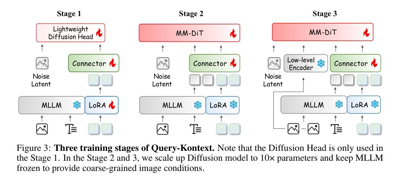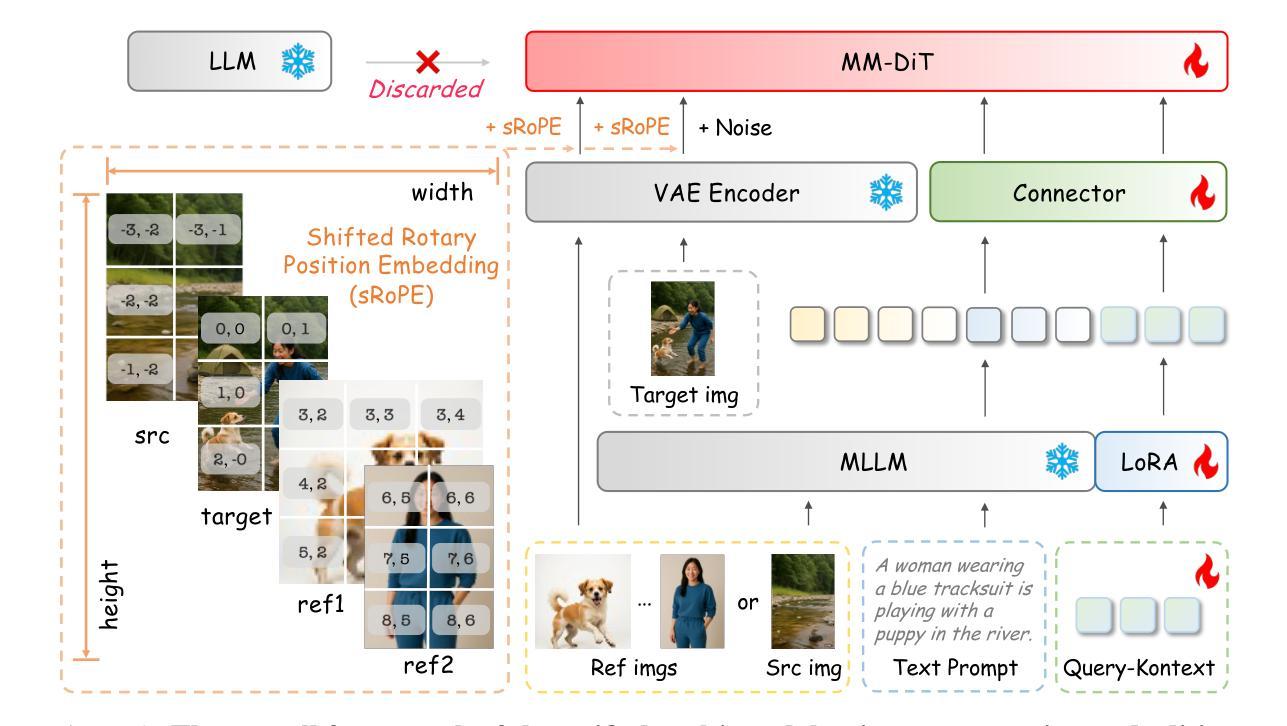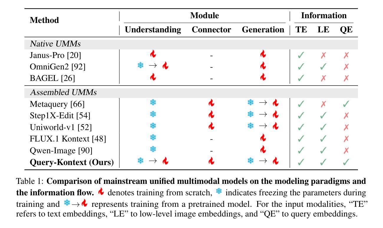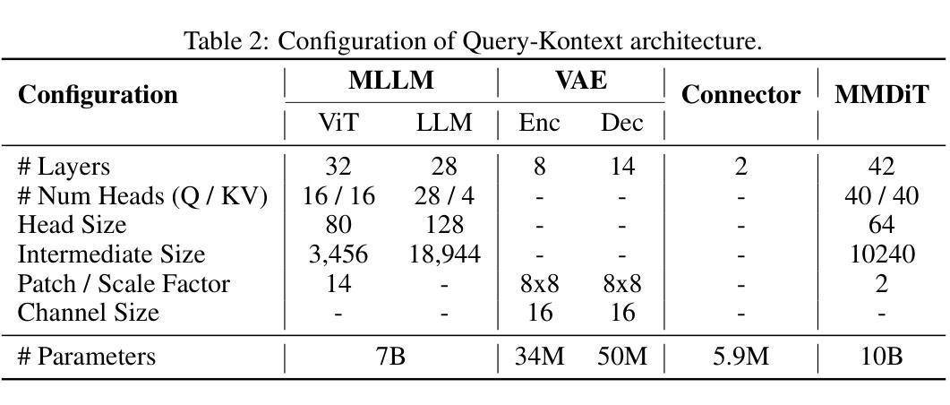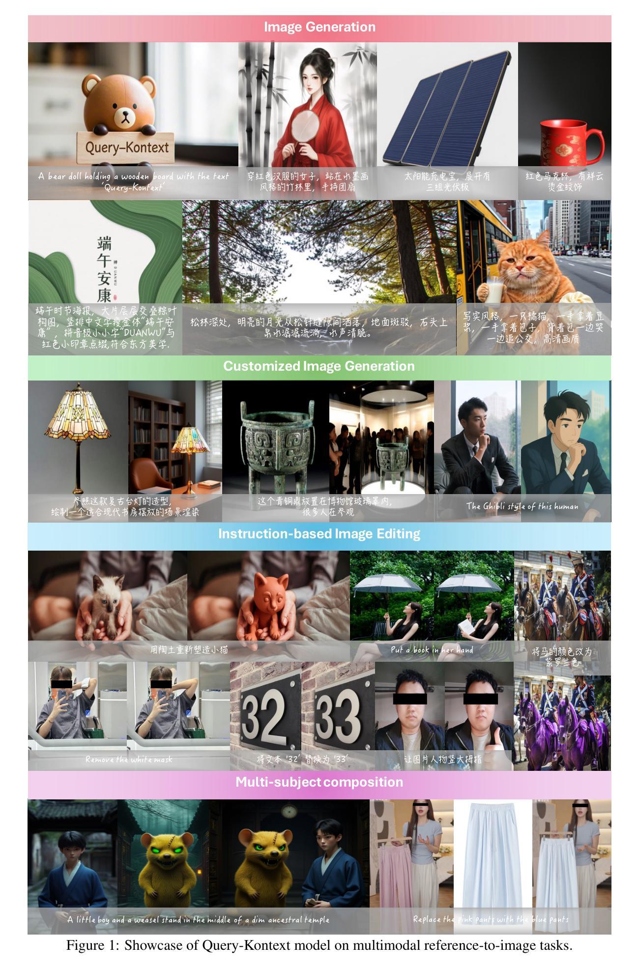统一多模态模型(UMMs)在文本到图像生成(T2I)和编辑(TI2I)方面表现出了显著的性能,无论是作为集成了强大视觉语言模型(VLM)和基于扩散的生成器的统一框架,还是作为早期理解和生成模式融合的天真统一多模态模型。我们认为,在当前统一框架中,包含指令理解、接地和图像引用在内的多模态生成推理的关键能力,在身份保留和忠实重建方面与高清综合息息相关。在此工作中,我们引入了Query-Kontext这一新方法,它通过由语义线索和来自多模态输入的粗粒度图像条件组成的多模态``kontext’’,在视觉语言模型(VLM)和扩散模型之间建立了桥梁。这种设计将复杂的多模态生成推理能力委托给强大的VLM,同时保留扩散模型进行高质量视觉合成的作用。为了实现这一点,我们提出了一种分三阶段的渐进训练策略。首先,我们通过多模态kontext令牌将VLM连接到轻量级扩散头,以释放VLM的生成推理能力。其次,我们将此头扩展到大型预训练扩散模型,以提高视觉细节和逼真度。最后,我们引入低级别图像编码器,以提高图像保真度并在下游任务上进行指令调整。此外,我们建立了一个综合数据管道,整合真实、合成和开源数据集,涵盖多样化的多模态参考到图像场景,包括图像生成、指令驱动编辑、定制生成和多主题组合。实验表明,我们的方法与强大的统一基线相匹配,甚至在某些情况下超过了任务特定的最新方法。