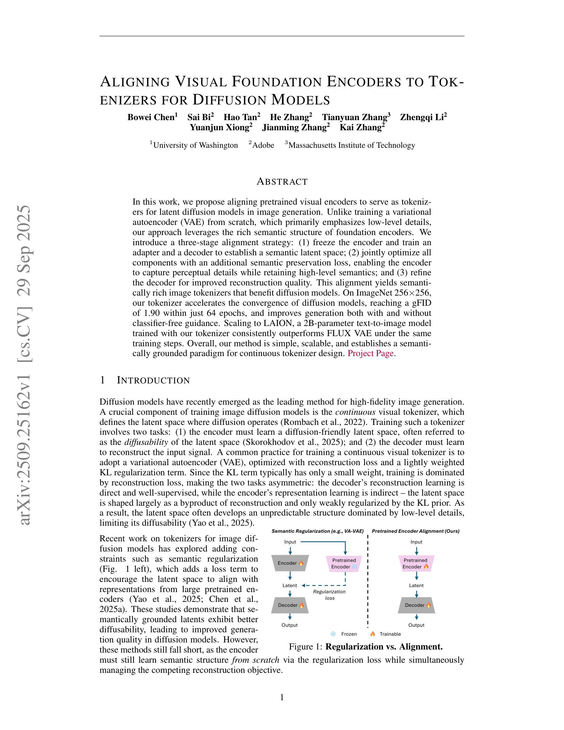 本文提出将预训练的视觉编码器对齐,用作图像生成中潜在扩散模型的标记器。该方法不同于从头开始训练变分自编码器(VAE),而侧重于利用基础编码器的丰富语义结构。引入的三阶段对齐策略包括:冻结编码器,训练适配器和解码器以建立语义潜在空间;联合优化所有组件,并添加语义保留损失,使编码器能够捕获感知细节并保留高级语义;以及改进解码器的重建质量。这种对齐方式生成了有益于扩散模型的语义丰富的图像标记器。在ImageNet 256x256上,该标记器加速了扩散模型的收敛,仅64个周期就达到了1.90的gFID,并在有和无分类器引导的情况下都提高了生成质量。在LAION上扩展到2B参数的文本到图像模型,使用此标记器的表现始终优于FLUX VAE。总体而言,该方法简单、可扩展,并为连续标记器设计建立了语义基础的模式。