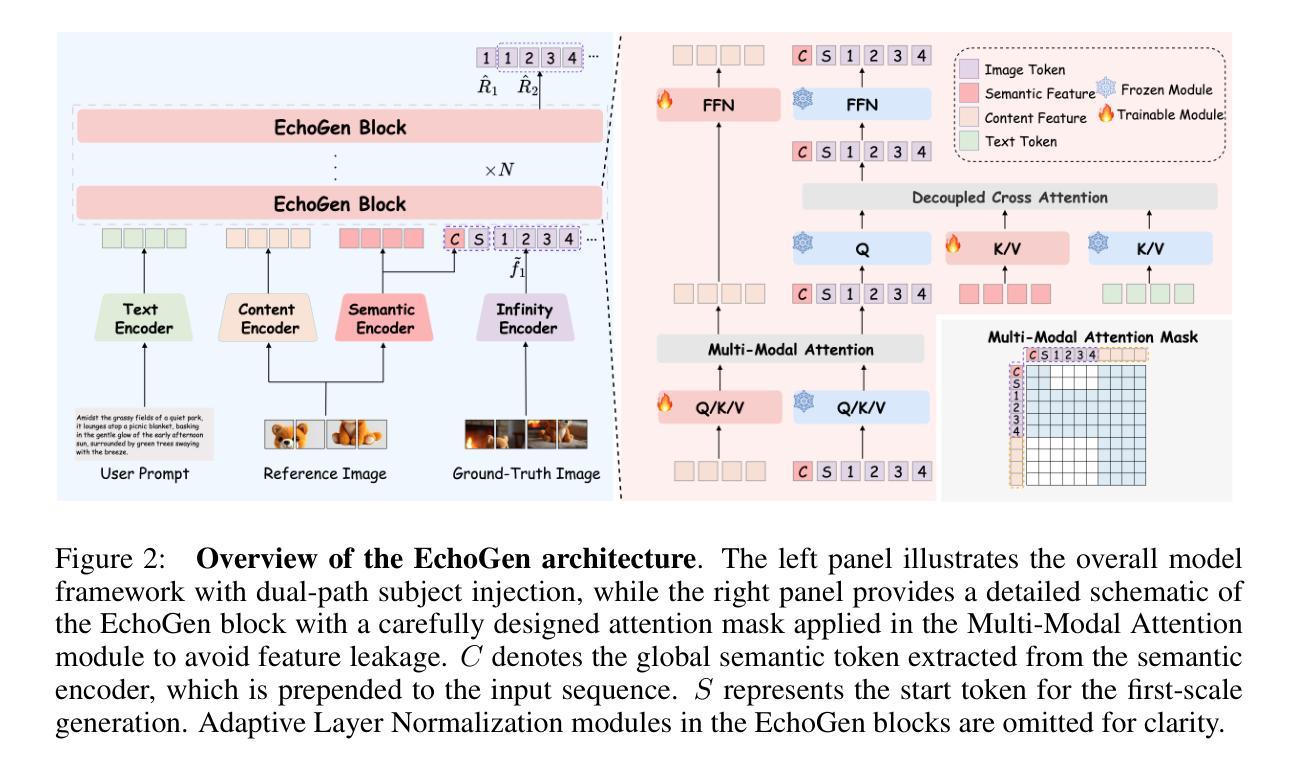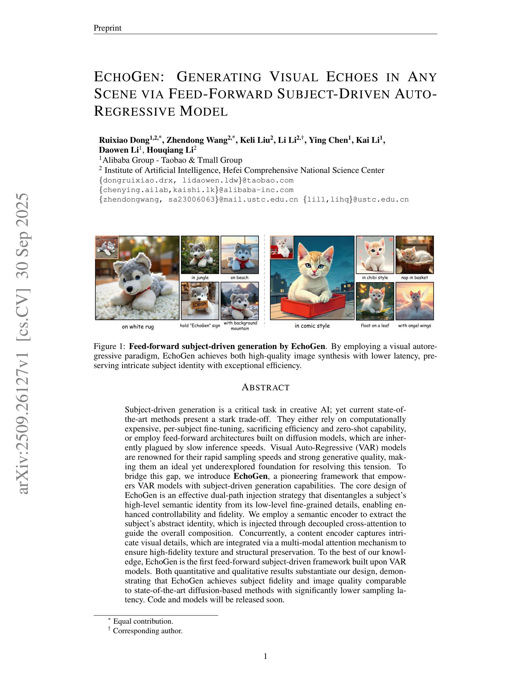 主题驱动生成是创造性AI中的关键任务;然而,当前最先进的方法呈现出明显的权衡。它们要么依赖于计算量大、针对每个主题的微调,牺牲了效率和零样本能力,要么采用基于扩散模型的前馈架构,这固有地导致推理速度较慢。视觉自回归(VAR)模型以其快速采样速度和强大的生成质量而闻名,是解决这个问题的理想但尚未被充分探索的基础。为了弥补这一差距,我们引入了EchoGen,这是一个赋能VAR模型主题驱动生成能力的开创性框架。EchoGen的核心设计是一个有效的双路径注入策略,该策略将一个主题的高级语义身份与其低级精细细节分开,从而增强了可控性和保真度。我们采用语义编码器提取主题的抽象身份,通过解耦交叉注意力注入来引导整体构图。同时,内容编码器捕捉复杂的视觉细节,通过多模态注意力机制集成,以确保高保真纹理和结构保留。据我们所知,EchoGen是基于VAR模型的第一个前馈主题驱动框架。定量和定性结果都证明了我们设计的合理性,证明EchoGen在主题保真度和图像质量方面达到了与最先进的扩散模型相当的水平,同时采样延迟更低。代码和模型将很快发布。