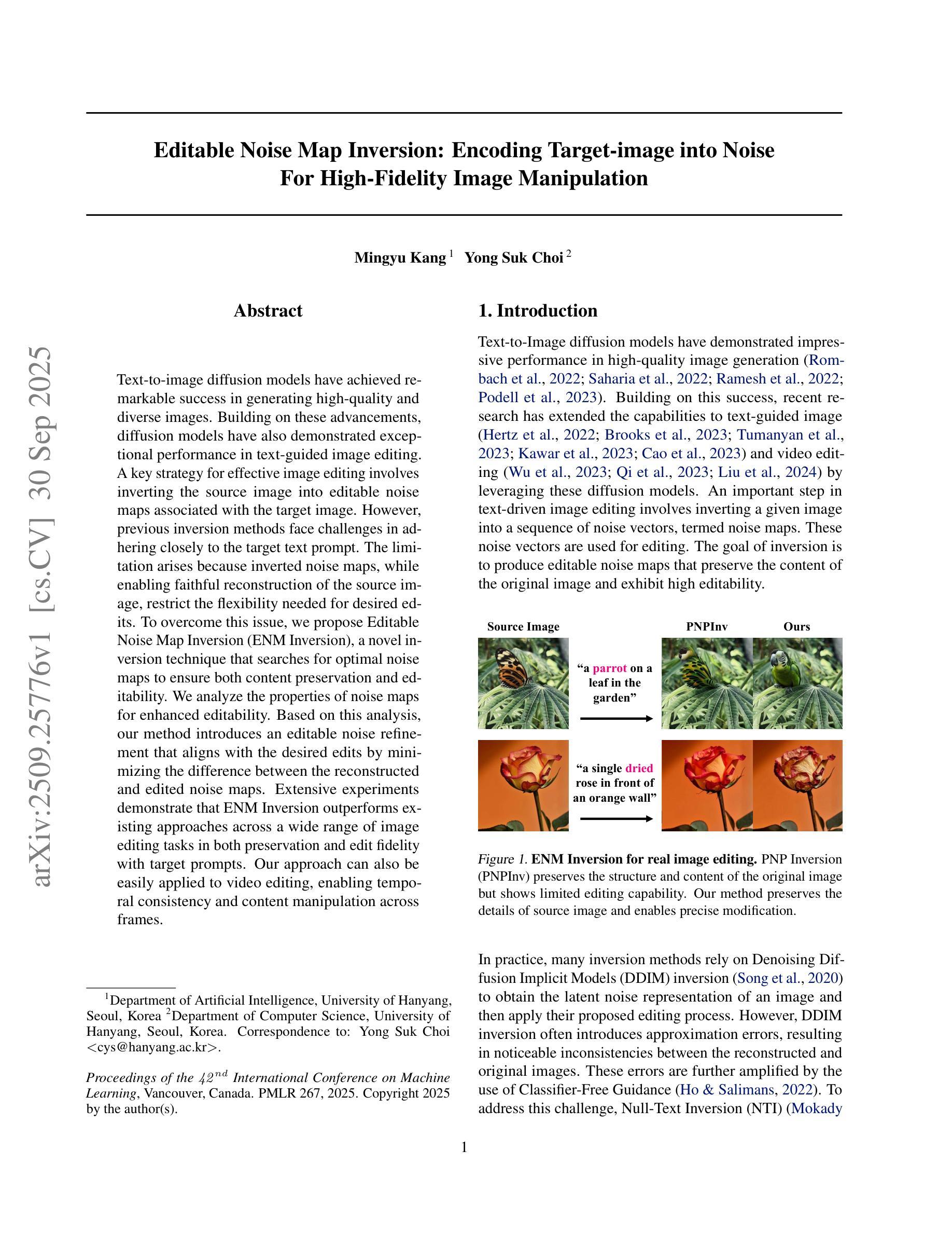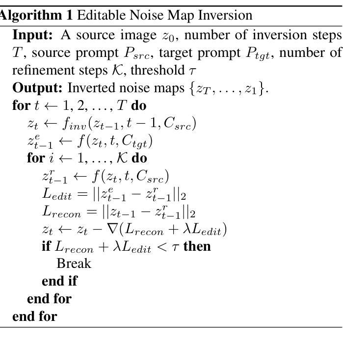 文本到图像的扩散模型在生成高质量和多样化的图像方面取得了显著的成功。在此基础上,扩散模型在文本引导的图像编辑方面也表现出了卓越的性能。实现有效图像编辑的关键策略是将源图像反转为与目标图像相关的可编辑噪声图。然而,以前的反转方法在面对紧密遵循目标文本提示时面临挑战。这种限制的产生是因为反转的噪声图虽然能够使源图像进行忠实的重建,但限制了所需的编辑灵活性。为了解决这个问题,我们提出了可编辑噪声图反转(ENM反转)这一新型反转技术,寻找最佳噪声图,以确保内容和可编辑性的保留。我们分析了噪声图的属性,以提高其可编辑性。基于这一分析,我们的方法引入了一种可编辑的噪声细化,通过最小化重建和编辑噪声图之间的差异,与所需的编辑保持一致。大量实验表明,在广泛图像编辑任务中,ENM反转在保留和编辑保真度方面均优于现有方法并符合目标提示。我们的方法还可以轻松应用于视频编辑,实现跨帧的时间一致性和内容操作。