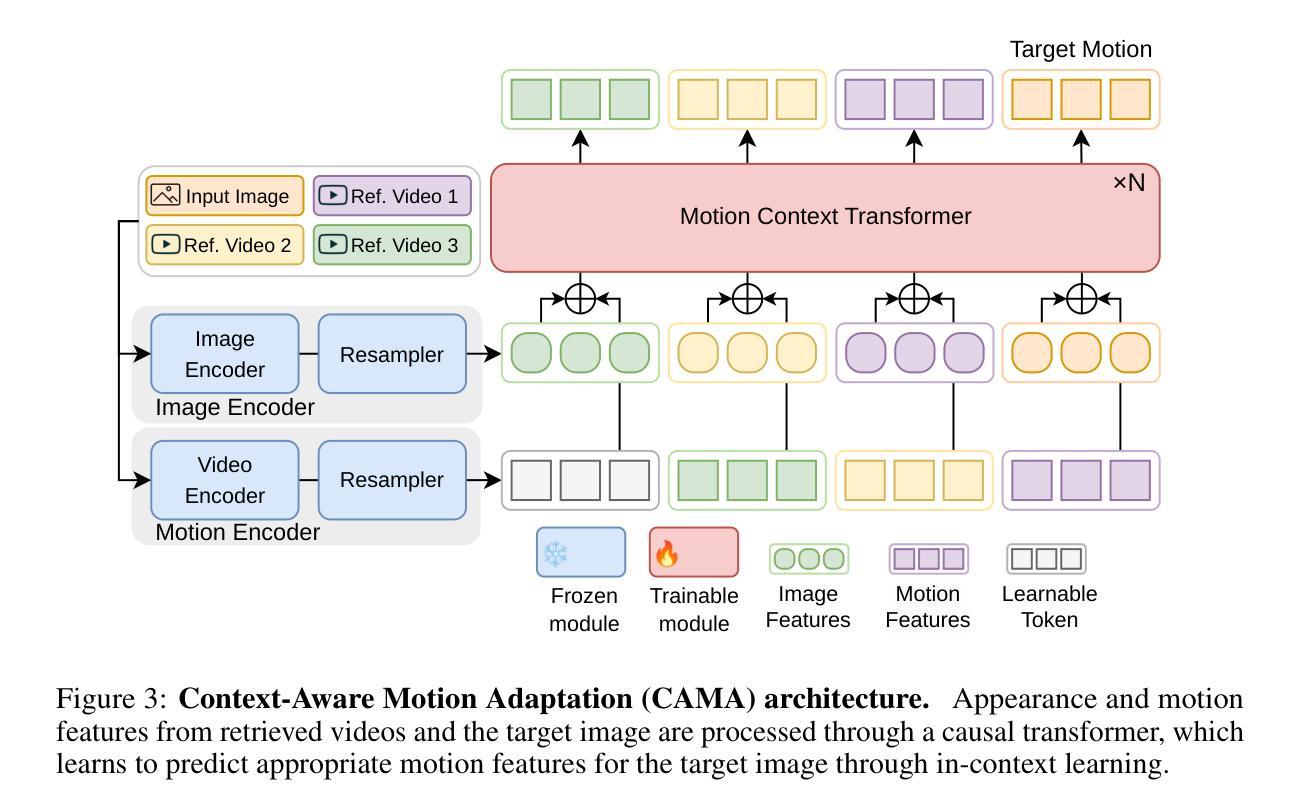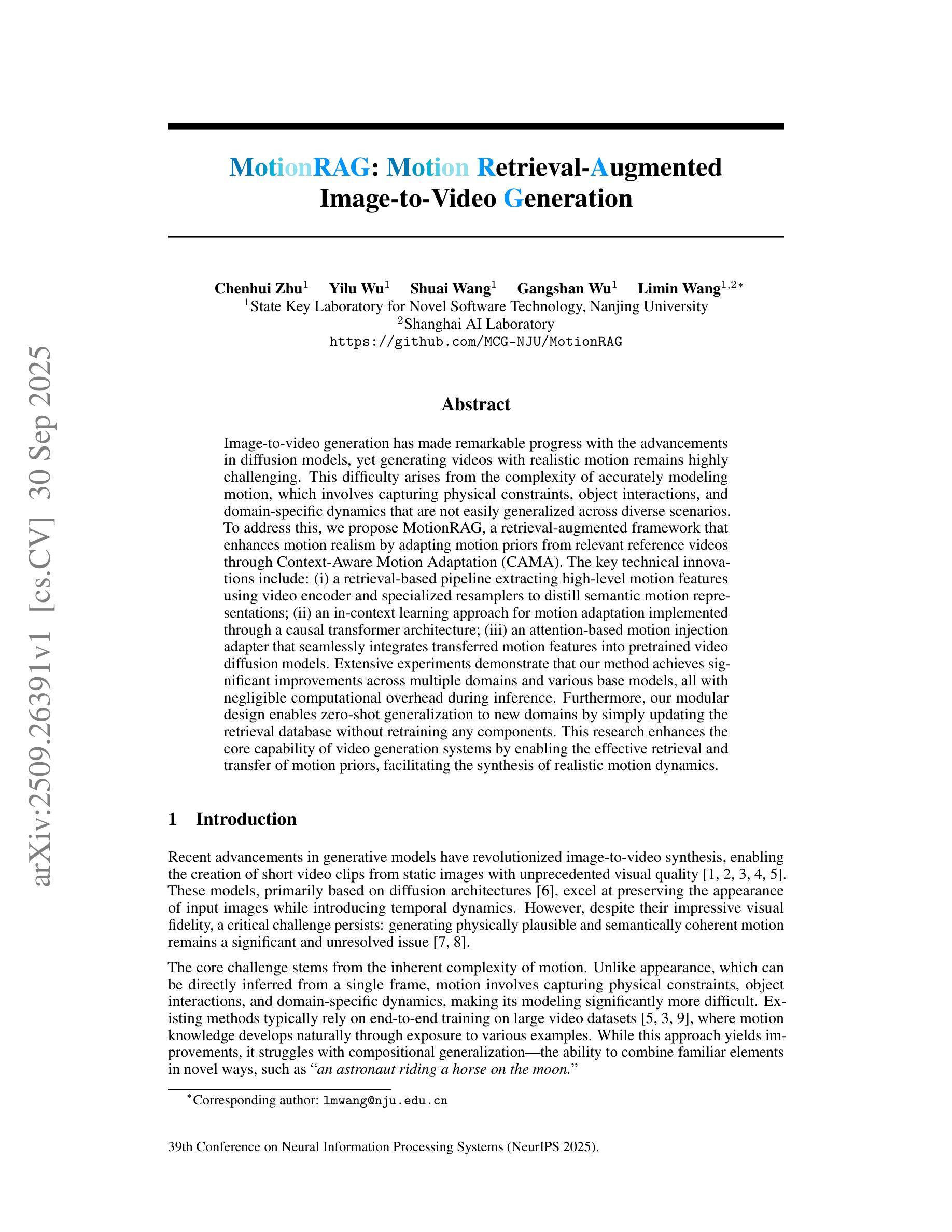 随着扩散模型的发展,图像到视频的生成已经取得了显著的进步,但生成具有真实感的运动的视频仍然极具挑战性。这一难度源于准确建模运动的复杂性,其中包括捕捉物理约束、物体交互和特定领域的动态,这些不容易在多种场景中通用化。为了解决这一问题,我们提出了MotionRAG,这是一个增强型检索框架,通过上下文感知运动适应(CAMA)从相关参考视频中适应运动先验知识,提高运动真实性。主要技术创新包括:(i)基于检索的管道使用视频编码器和专用重采样器提取高级运动特征,以蒸馏语义运动表示;(ii)通过因果变压器架构实现运动适应的上下文内学习方法;(iii)基于注意力的运动注入适配器无缝集成转移的运动特征到预训练的视频扩散模型中。大量实验表明,我们的方法在多个领域和各种基础模型上都取得了显著的改进,推理过程中的计算开销微乎其微。此外,我们的模块化设计通过简单地更新检索数据库而无需重新训练任何组件,实现了零镜头跨域推广。这项研究通过实现有效的运动先验检索和转移,提高了视频生成系统的核心能力,促进了真实运动动态的合成。