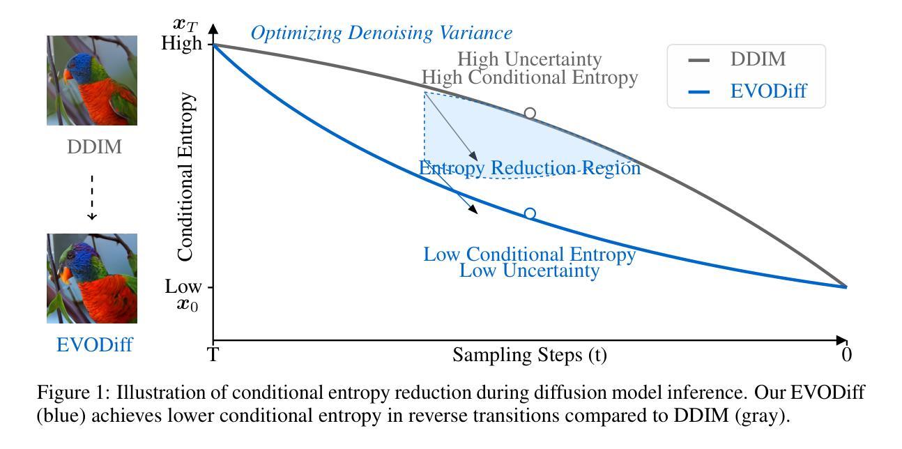 扩散模型(DMs)在图像生成方面表现出色,但存在推理速度慢和训练推理差异等问题。虽然像DPM-Solver这样的基于梯度的求解器可以加速去噪推理,但它们在信息传输效率方面缺乏理论基础。在这项工作中,我们从信息理论的角度介绍了扩散模型推理过程,发现成功的去噪从根本上减少了反向转换中的条件熵。这一原则让我们深入理解了推理过程:(1)数据预测参数化表现优于噪声对照;(2)优化条件方差提供了一种无参考的方式来最小化转换和重建误差。基于这些见解,我们提出了一种用于扩散模型生成过程的熵感知方差优化方法,称为EVODiff,它通过去噪过程中优化条件熵来系统地减少不确定性。对扩散模型的广泛实验验证了我们见解的有效性,并证明我们的方法显著且持续地优于最先进的基于梯度的求解器。例如,与DPM-Solver++相比,EVODiff在CIFAR-10上的重建错误降低了45.5%(在10次函数评估(NFE)中,FID从5.10提高到2.78),在ImageNet-256上高质量样本的NFE成本降低了25%(从20次降至15次NFE),同时改进了文本到图像的生成并减少了伪影。代码可在https://github.com/ShiguiLi/EVODiff上找到。
