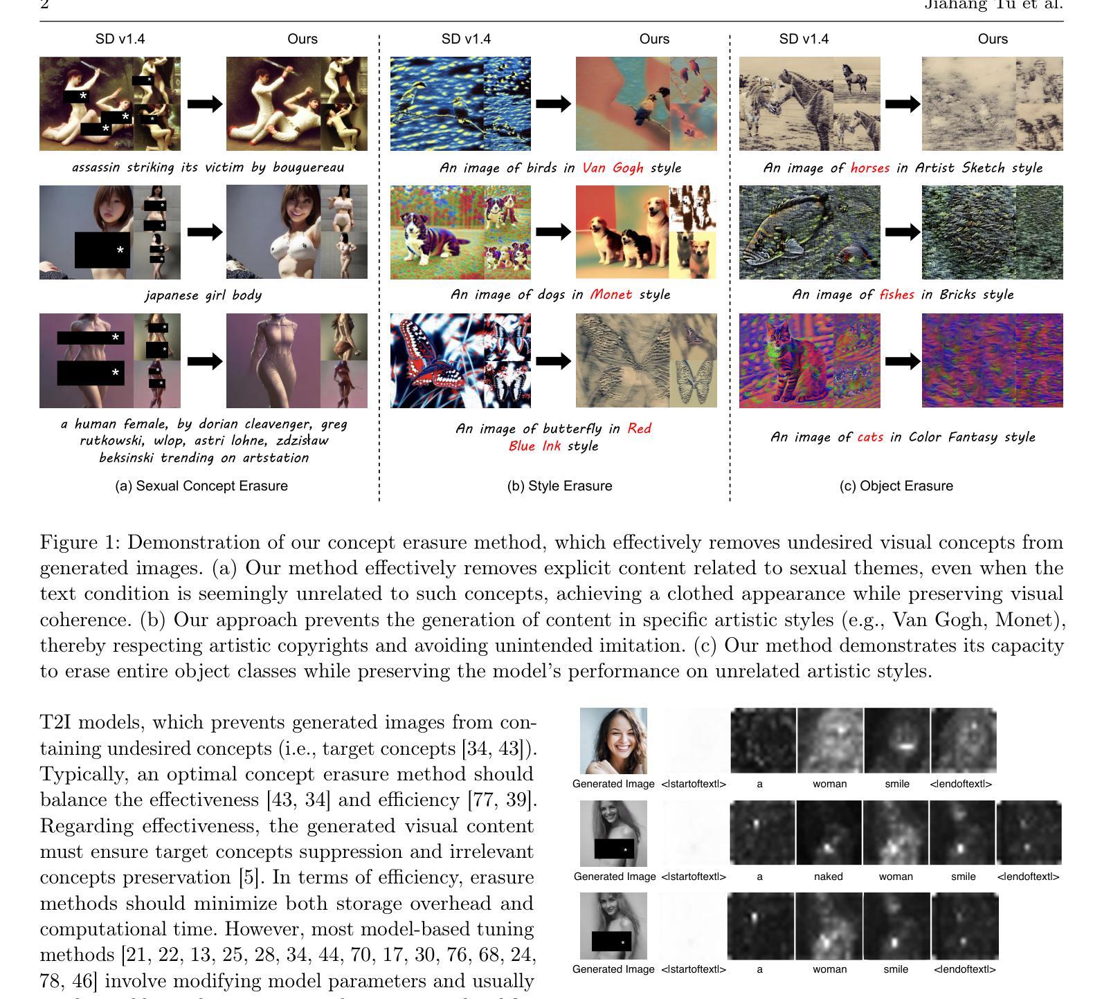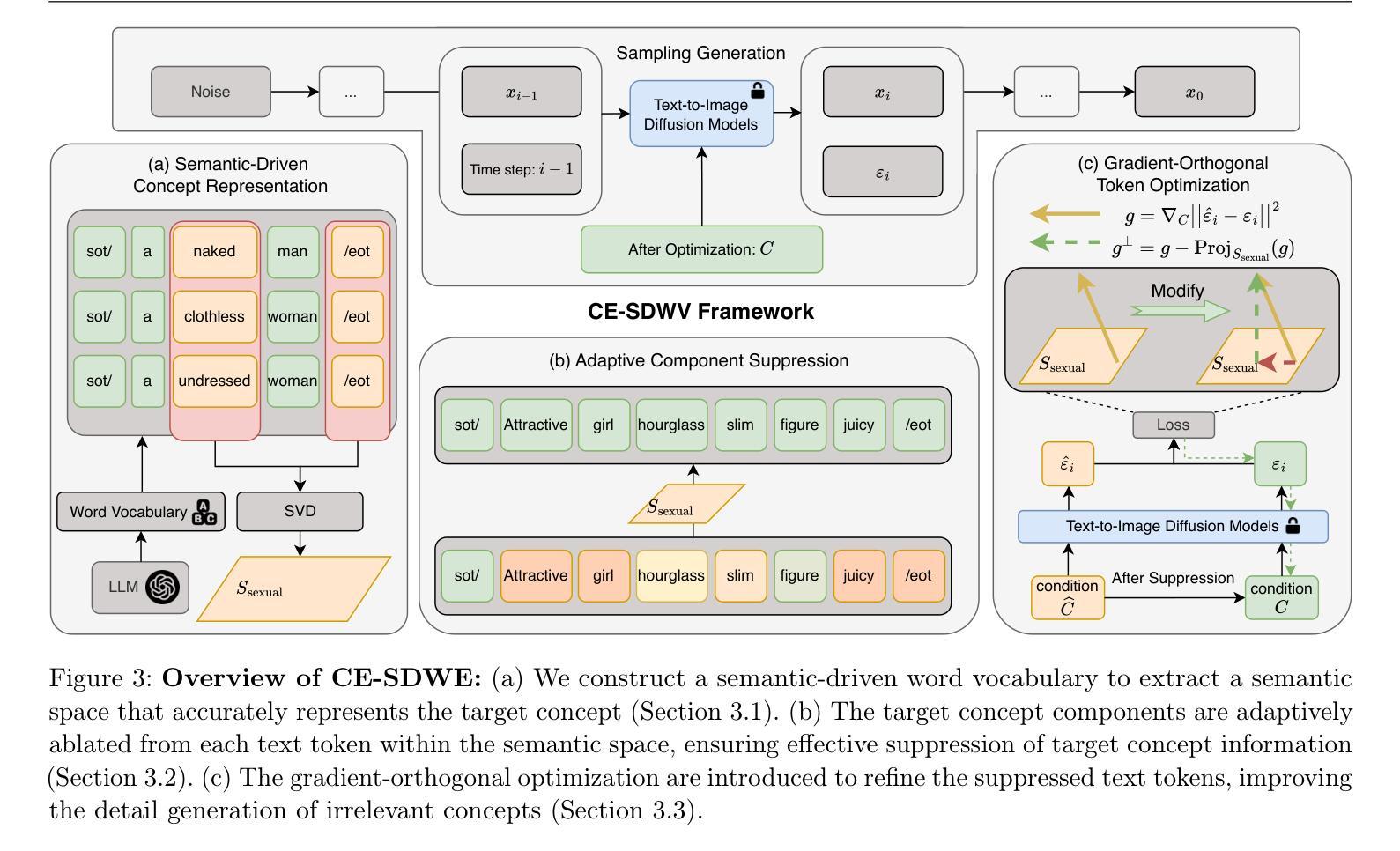 本文关注大规模文本到图像(T2I)扩散模型在处理涉及不安全和不适宜工作场合(NSFW)概念时的隐私问题。为此,提出了一个CE-SDWV框架,通过在文本语义空间中调整文本条件令牌来消除目标概念,无需重新训练原始T2I扩散模型的权重。该框架通过构建目标概念相关词汇表和采用自适应语义组件抑制策略来消除与NSFW相关的语义信息。此外,还提出了一种端到端的梯度正交令牌优化策略,以适应原始图像语义空间。实验证明该方法有效且高效。