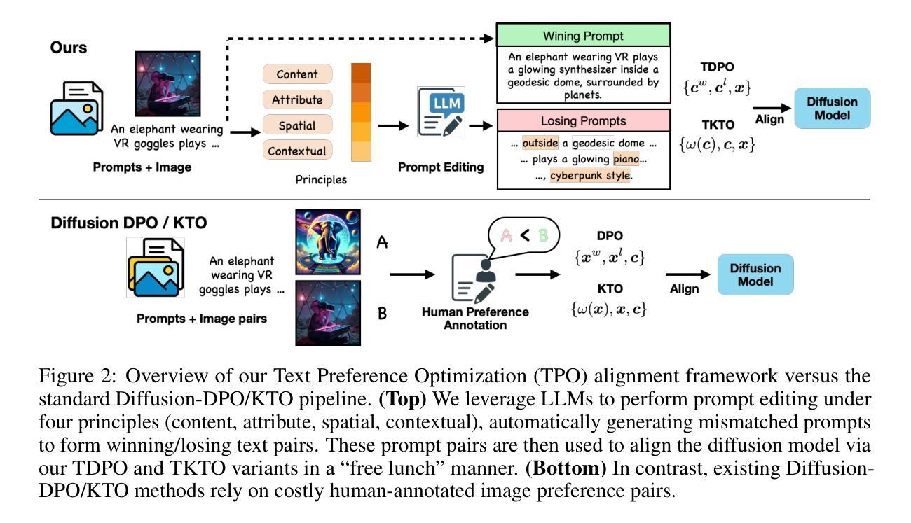 文本到图像(T2I)扩散模型在生成高质量图像方面取得了显著成功,但文本与生成图像之间的准确对齐仍是挑战。现有研究采用强化学习结合人类反馈(RLHF)来优化对齐。然而,这种方法需要大量高质量的人类标注数据,存在可扩展性限制。本文提出了文本偏好优化(TPO)框架,无需配对图像偏好数据即可实现T2I模型的“免费午餐”对齐。通过训练模型以偏好匹配提示而非不匹配提示来实现对齐,不匹配提示是通过使用大型语言模型扰动原始标题构建的。我们的框架具有通用性,可与现有的基于偏好的算法相结合。定量和定性评估表明,我们的方法始终优于其原始方法,并提高了人类偏好得分和文本到图像的对齐精度。