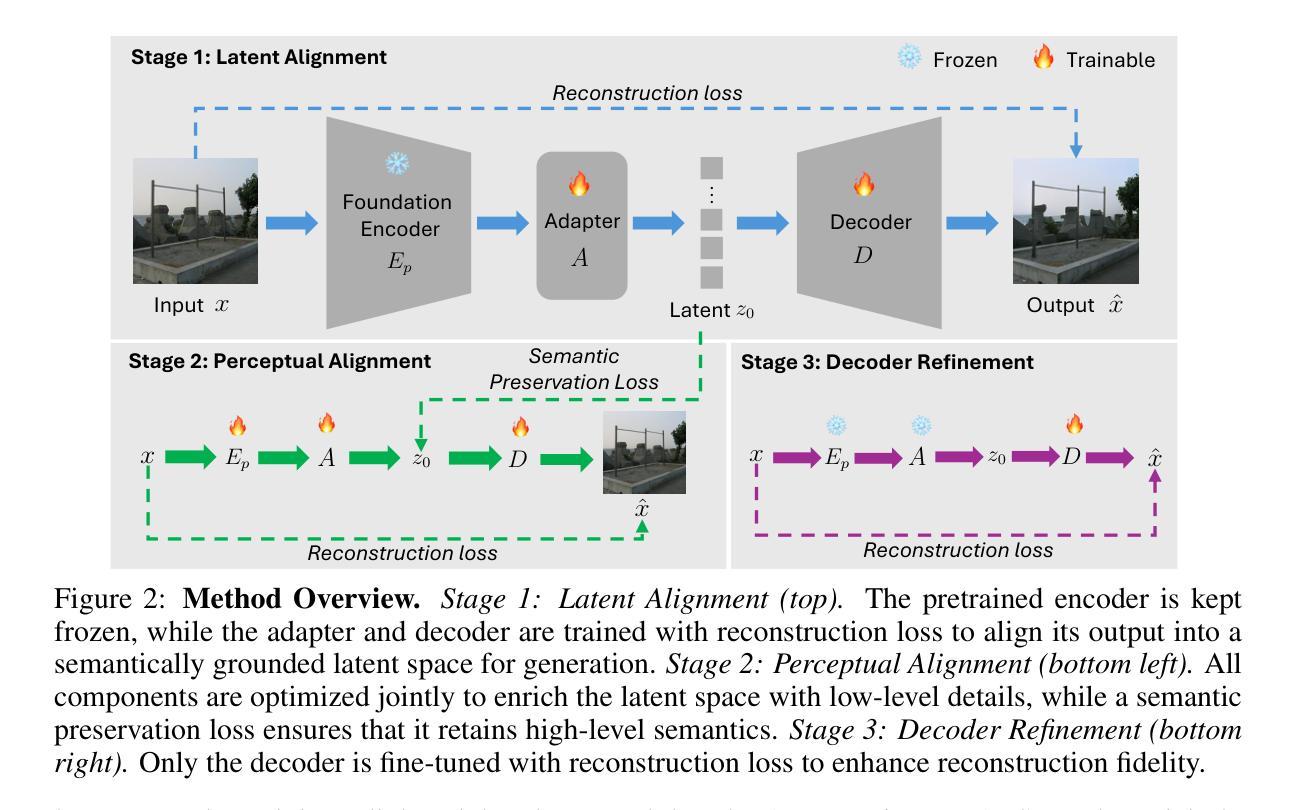 - 框架解决了基础模型与深度压缩潜在空间的表示差距问题,通过嵌入对齐训练进行弥合。
