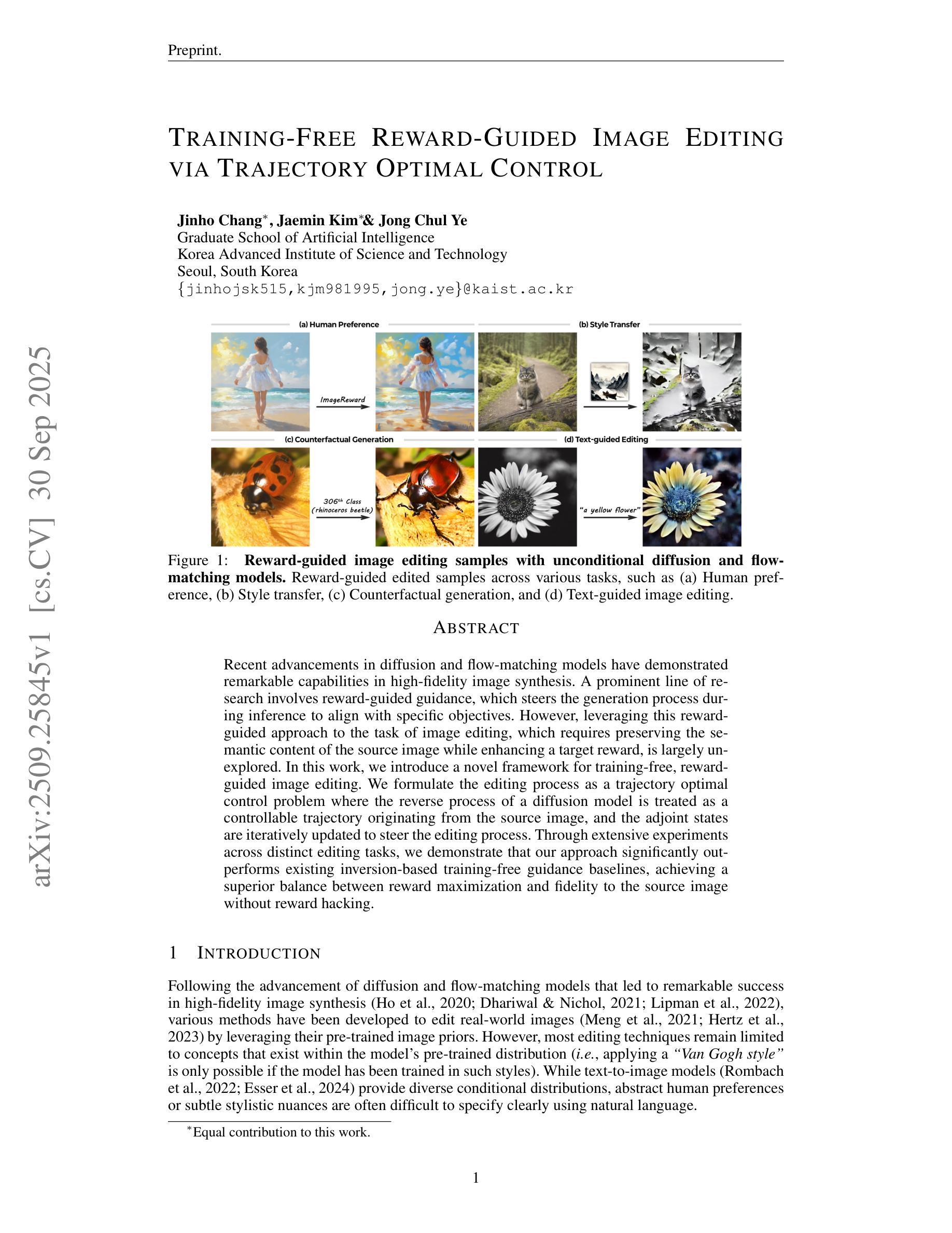 近期扩散模型和流匹配模型的进展在高保真图像合成中展示了显著的能力。一个突出的研究方向是奖励引导指导,它在推理过程中引导生成过程以符合特定目标。然而,将这一奖励引导方法应用于图像编辑任务——需要在保留源图像语义内容的同时提高目标奖励——却很少被探索。在这项工作中,我们介绍了一种无需训练、奖励引导的图像编辑新框架。我们将编辑过程制定为一个轨迹最优控制问题,其中扩散模型的逆向过程被视为一条可控轨迹,起源于源图像,并且伴随状态被迭代更新以引导编辑过程。通过在不同编辑任务上的广泛实验,我们证明我们的方法显著优于现有的基于反演的无需训练指导基线,在奖励最大化和对源图像的保真度之间取得了优越平衡,且无需奖励黑客行为。