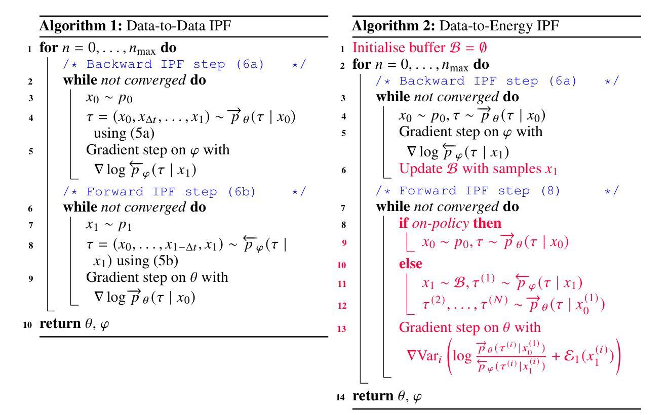 - 论文提出的算法基于迭代比例拟合(IPF)的推广,适用于数据不可用的情况,受到强化学习的启发。它在合成问题上表现出色,能成功学习多模态分布之间的传输。