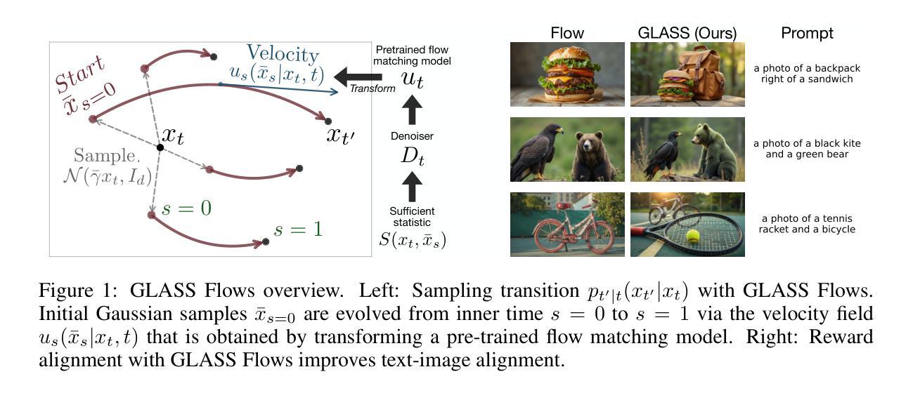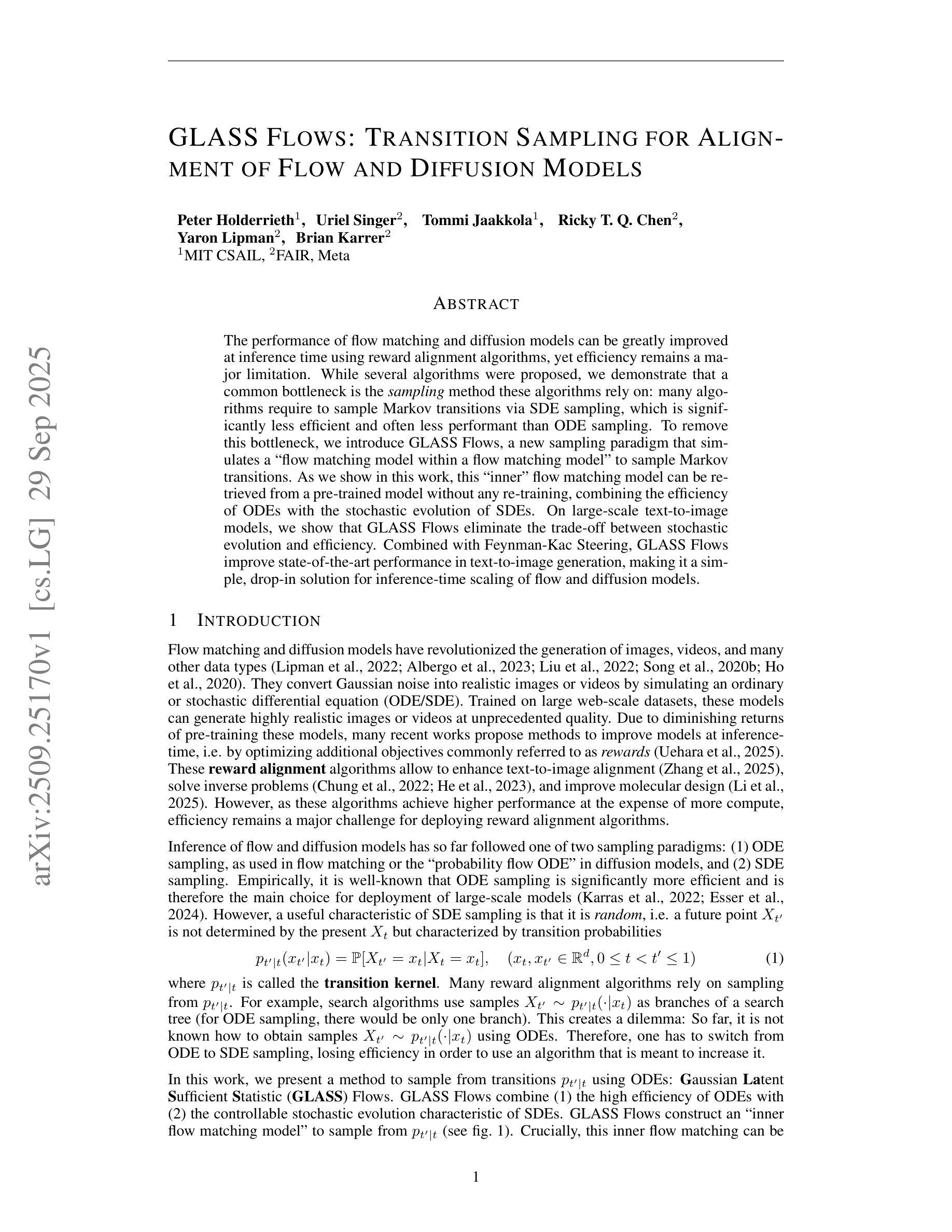 流匹配和扩散模型的性能可通过使用奖励对齐算法在推理时间显著提高,但效率仍是主要限制。虽然已提出多种算法,但演示表明,这些算法所依赖的采样方法是共同瓶颈:许多算法需要通过随机微分方程(SDE)采样进行马尔可夫过渡采样,这显著降低了效率并且往往性能不如常微分方程(ODE)采样。为了消除这一瓶颈,我们引入了GLASS流这一新采样范式,它通过模拟“流匹配模型内的流匹配模型”来采样马尔可夫过渡。我们在工作中展示,这个“内部”流匹配模型可以从预训练模型中提取,无需任何再训练,结合了ODE的效率与SDE的随机演变。在大型文本到图像模型中,我们展示GLASS流消除了随机演变与效率之间的权衡。结合费曼-卡克转向,GLASS流提高了文本到图像生成的最先进性能,成为流和扩散模型推理时间扩展的简单即插即用解决方案。