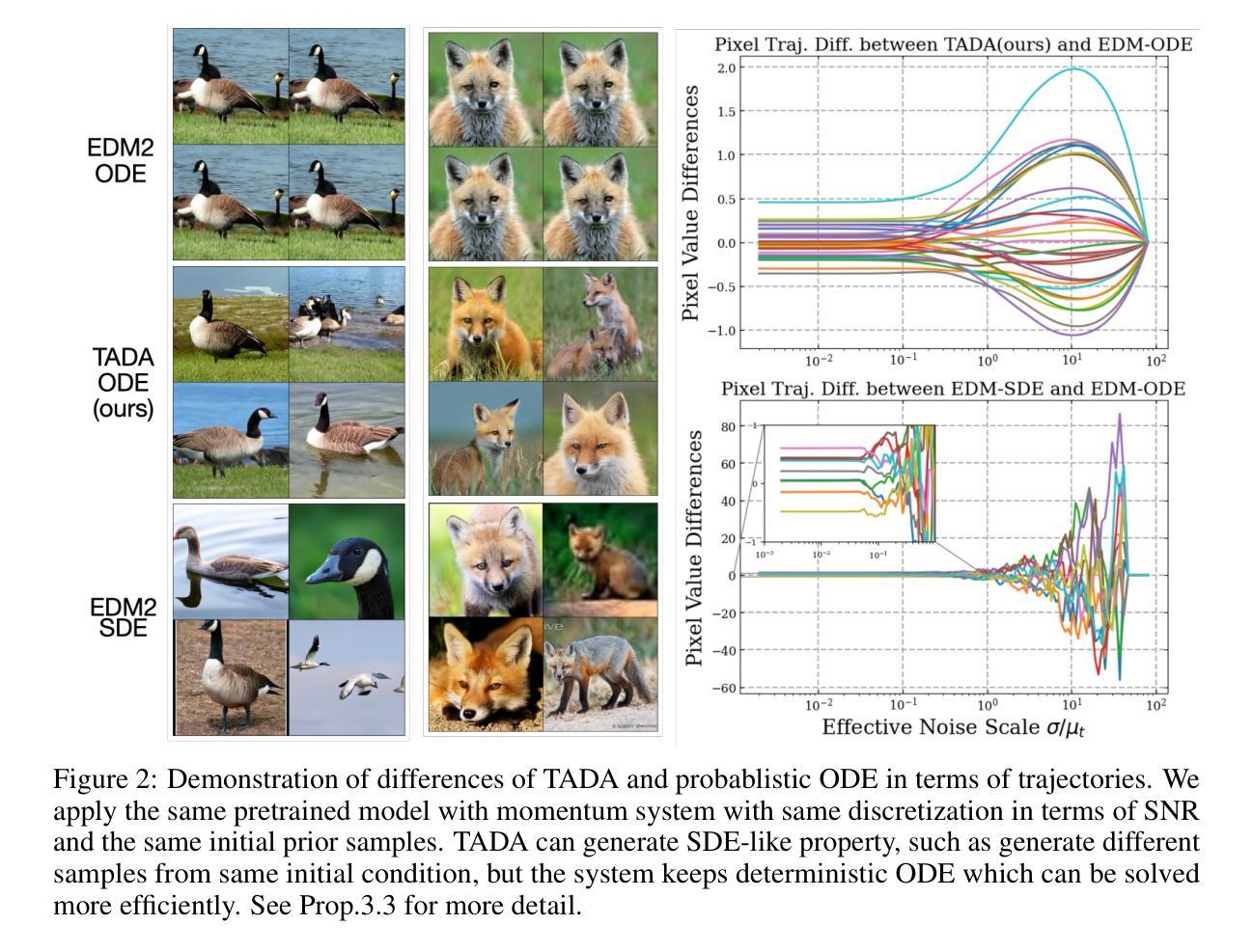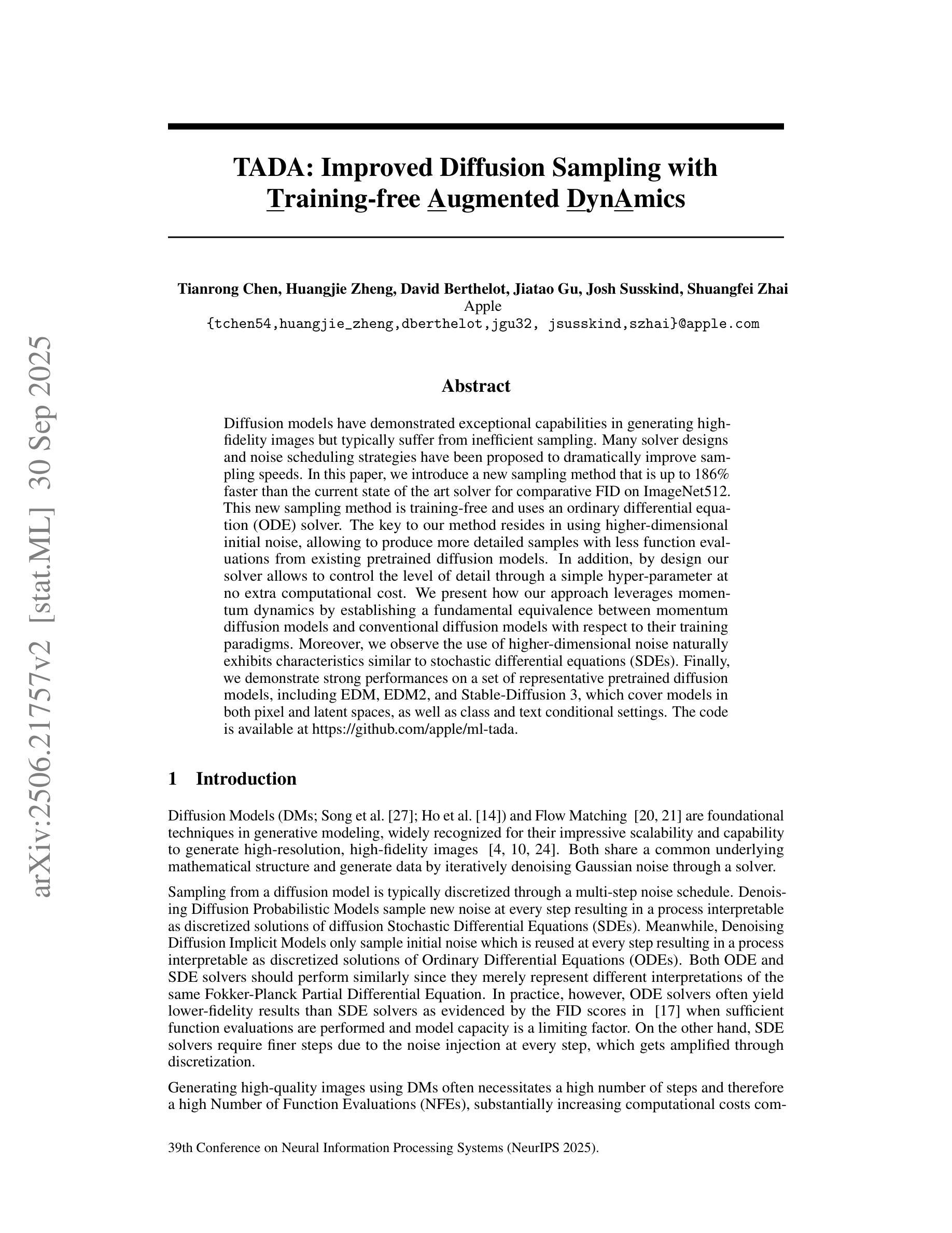 扩散模型在生成高保真图像方面表现出卓越的能力,但通常存在采样效率低下的问题。为了显著提高采样速度,已经提出了许多求解器设计和噪声调度策略。在本文中,我们介绍了一种新的采样方法,其速度比当前最先进的求解器在ImageNet512上进行比较时快达186%。这种新的采样方法无需训练,并使用常微分方程(ODE)求解器。我们的方法的关键在于使用高维初始噪声,从而利用现有的预训练扩散模型以较少的函数评估产生更详细的样本。此外,我们的求解器设计允许通过简单的超参数控制细节层次,而无需额外的计算成本。我们展示了我们的方法如何利用动量动力学,通过建立动量扩散模型与常规扩散模型在训练范式方面的基本等价关系。此外,我们观察到高维噪声的使用自然表现出与随机微分方程(SDEs)相似的特征。最后,我们在一组代表性的预训练扩散模型上展示了强大的性能,包括EDM、EDM2和Stable-Diffusion 3,这些模型涵盖了像素和潜在空间以及类和文本条件设置。代码可在https://github.com/apple/ml-tada找到。