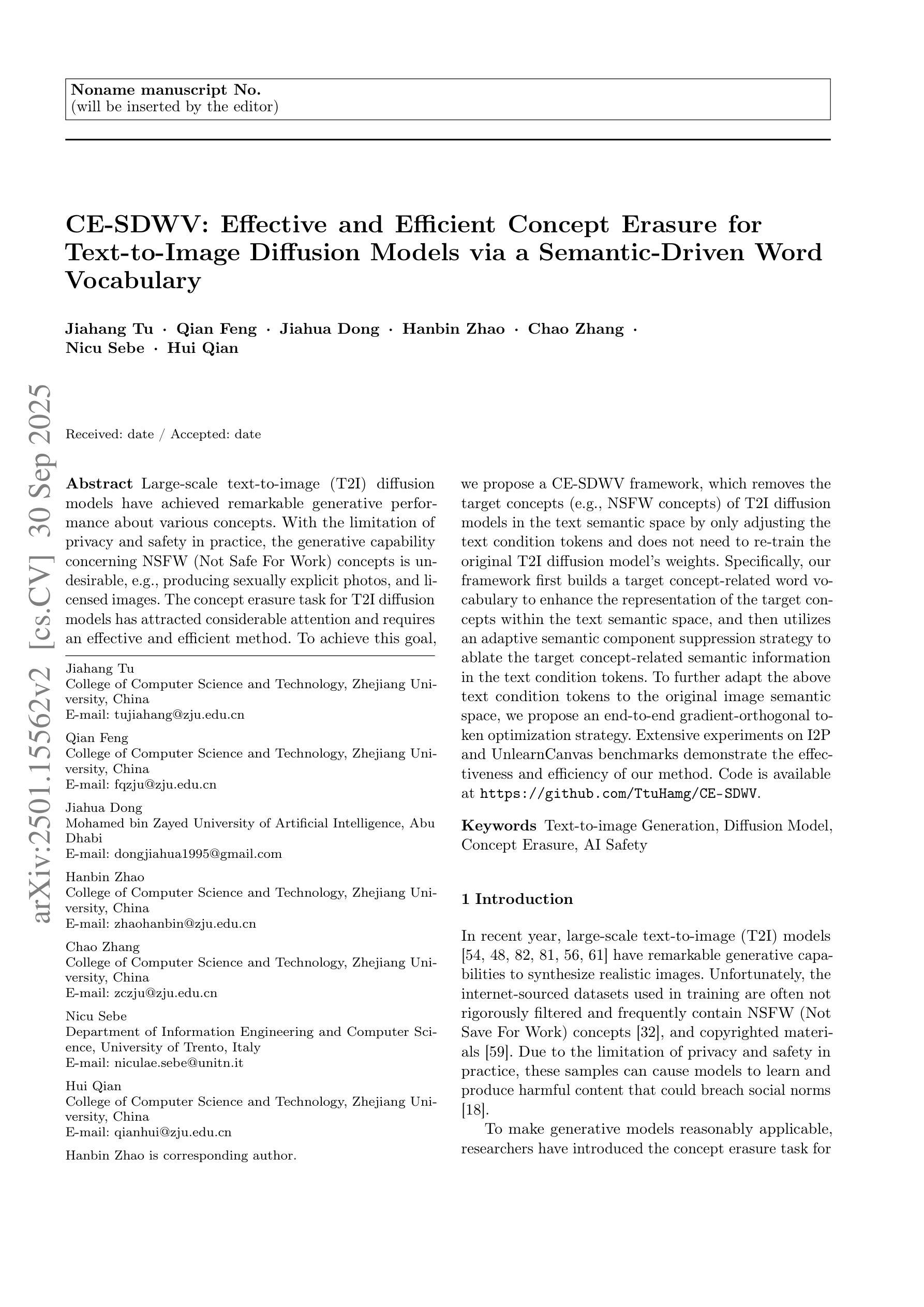 Large-scale text-to-image (T2I) diffusion models have achieved remarkable generative performance about various concepts. With the limitation of privacy and safety in practice, the generative capability concerning NSFW (Not Safe For Work) concepts is undesirable, e.g., producing sexually explicit photos, and licensed images. The concept erasure task for T2I diffusion models has attracted considerable attention and requires an effective and efficient method. To achieve this goal, we propose a CE-SDWV framework, which removes the target concepts (e.g., NSFW concepts) of T2I diffusion models in the text semantic space by only adjusting the text condition tokens and does not need to re-train the original T2I diffusion model’s weights. Specifically, our framework first builds a target concept-related word vocabulary to enhance the representation of the target concepts within the text semantic space, and then utilizes an adaptive semantic component suppression strategy to ablate the target concept-related semantic information in the text condition tokens. To further adapt the above text condition tokens to the original image semantic space, we propose an end-to-end gradient-orthogonal token optimization strategy. Extensive experiments on I2P and UnlearnCanvas benchmarks demonstrate the effectiveness and efficiency of our method. Code is available at https://github.com/TtuHamg/CE-SDWV.