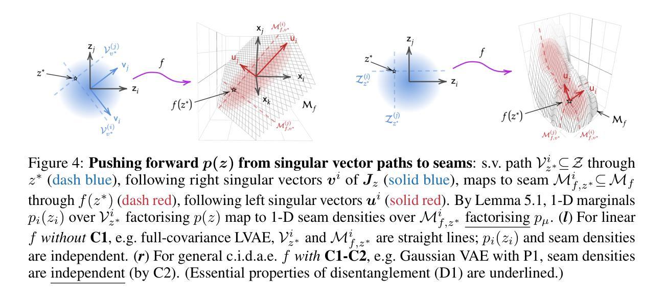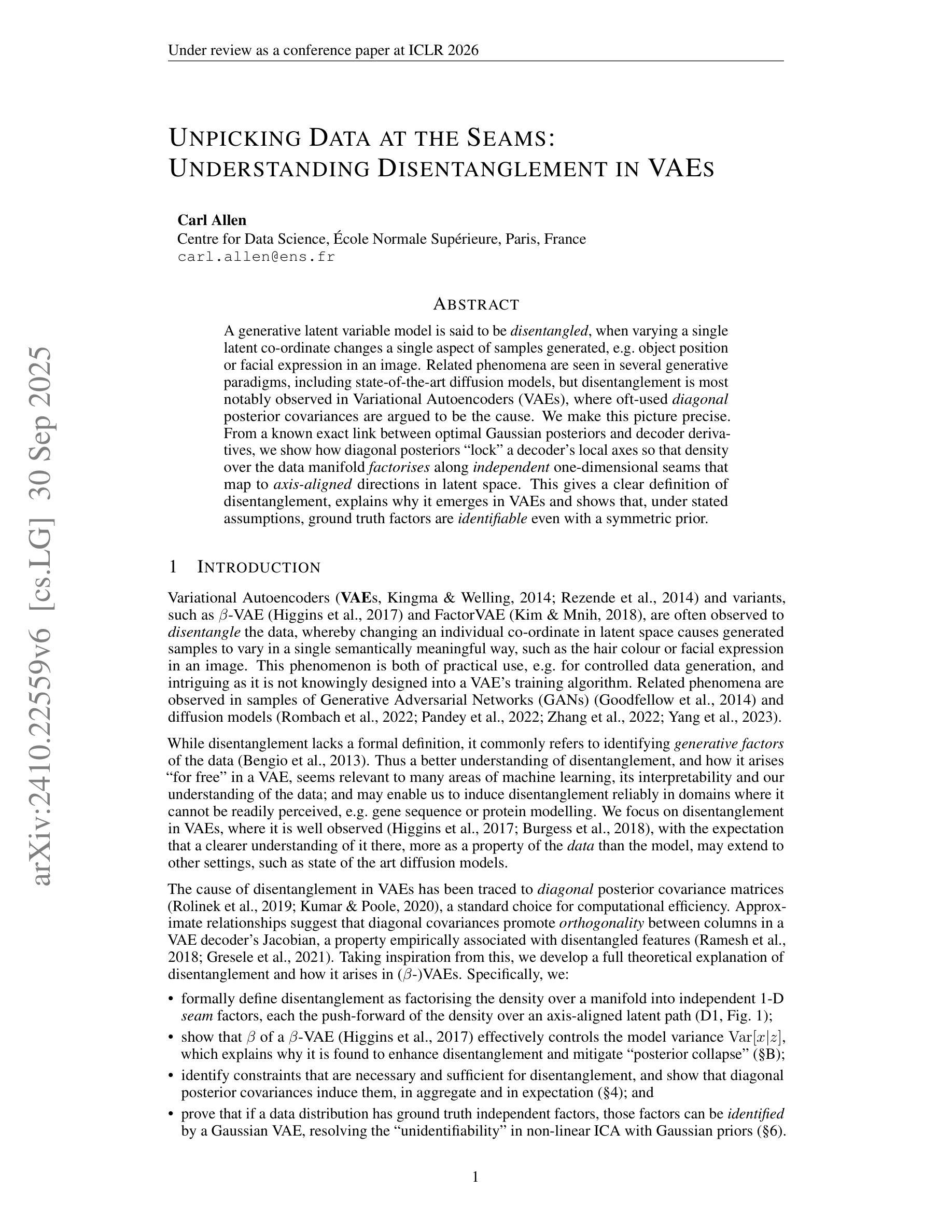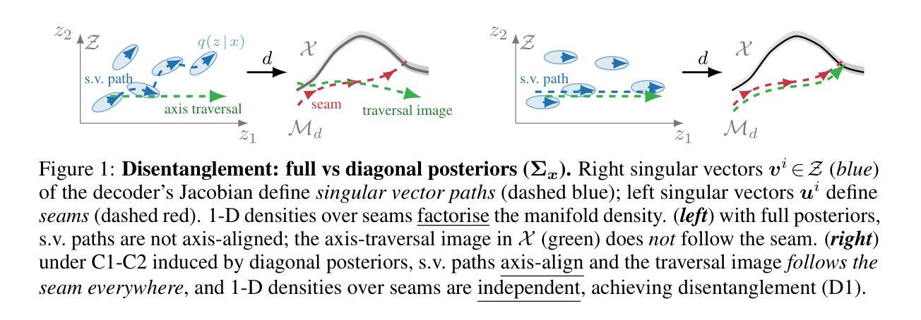 当一个生成潜在变量模型中的单一潜在坐标发生变化时,只会改变生成样本的单一方面,例如图像中的对象位置或面部表情,此时该模型被认为是解纠缠的。这种现象在多种生成模型中都可以看到,包括最先进的扩散模型,但在变分自编码器(VAEs)中,解纠缠现象最为明显,人们认为常用的对角后验协方差是造成这一现象的原因。我们使这一观点精确化。从已知的最优高斯后验和解码器导数之间的关联出发,我们展示了如何对角后验会“锁定”解码器的局部轴,使得数据流形上的密度能够沿着独立的一维接缝进行分解,这些接缝映射到潜在空间中的轴对齐方向。这为解纠缠提供了明确的定义,解释了为什么它会在VAEs中出现,并表明在假设条件下,即使使用对称先验,真实因素也是可以识别的。