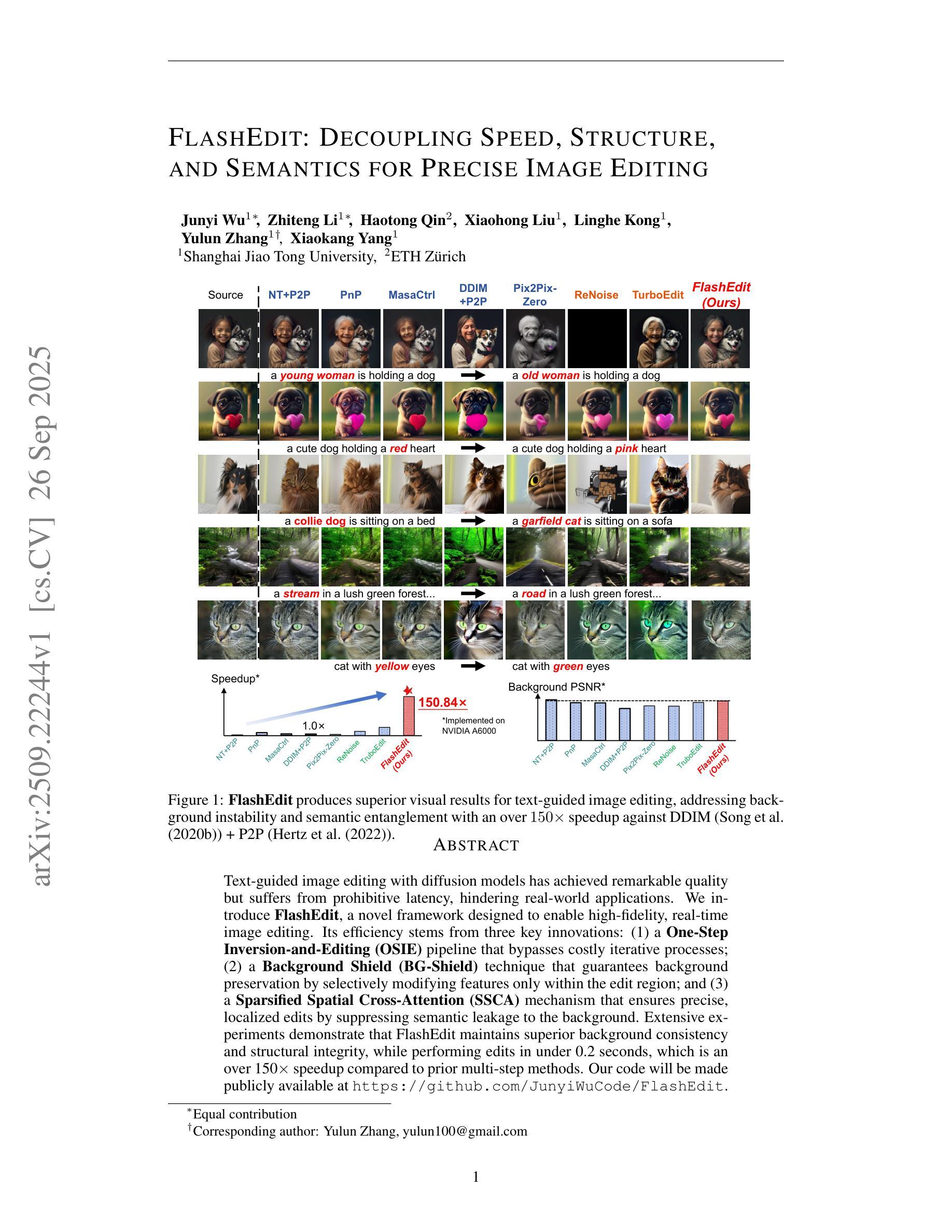 使用扩散模型进行文本引导的图像编辑已经取得了显著的品质,但依然面临难以承受的延迟问题,阻碍了其在现实世界的应用。我们引入了FlashEdit,这是一个新型框架,旨在实现高保真、实时的图像编辑。它的效率源于三个关键创新点:(1)一步式反转和编辑(OSIE)管道,绕过昂贵的迭代过程;(2)背景屏蔽(BG-Shield)技术,通过选择性修改仅编辑区域内的特征来保证背景保存;(3)稀疏空间交叉注意力(SSCA)机制,通过抑制语义泄露到背景来确保精确、局部编辑。大量实验表明,FlashEdit在保持背景一致性和结构完整性的同时,编辑时间不到0.2秒,与先前的多步骤方法相比,速度提高了超过150倍。我们的代码将在https://github.com/JunyiWuCode/FlashEdit上公开提供。