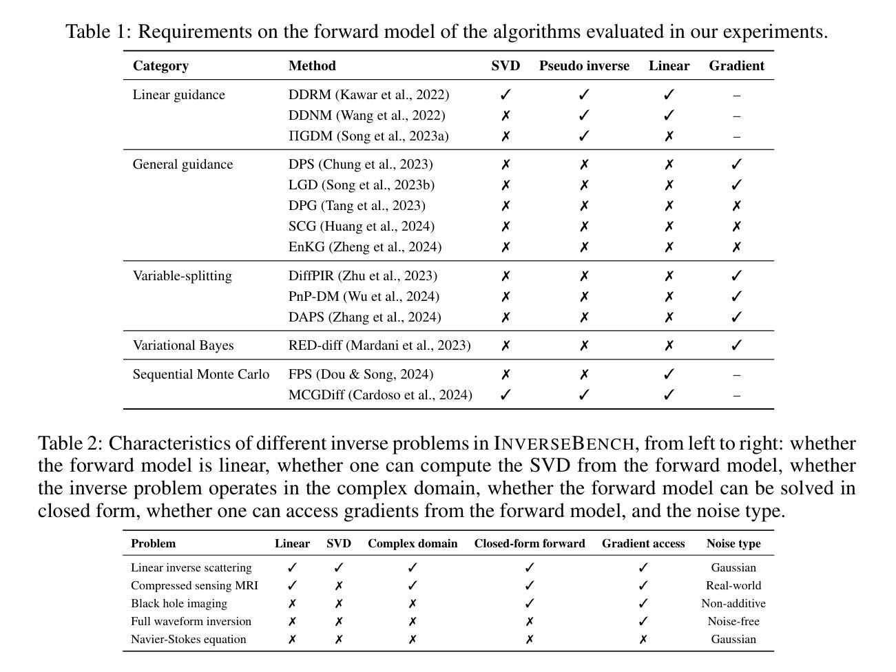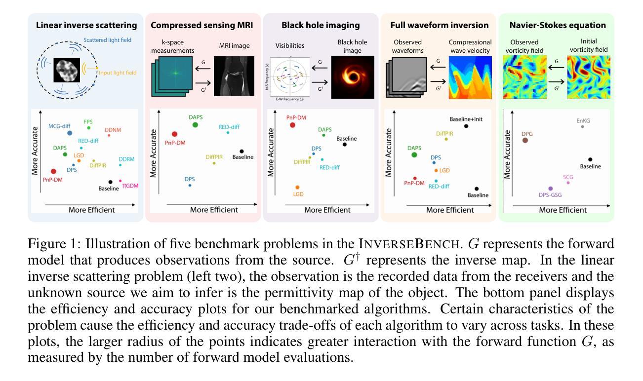 - \textsc{InverseBench}框架用于评估扩散模型在五个科学反问题上的表现。