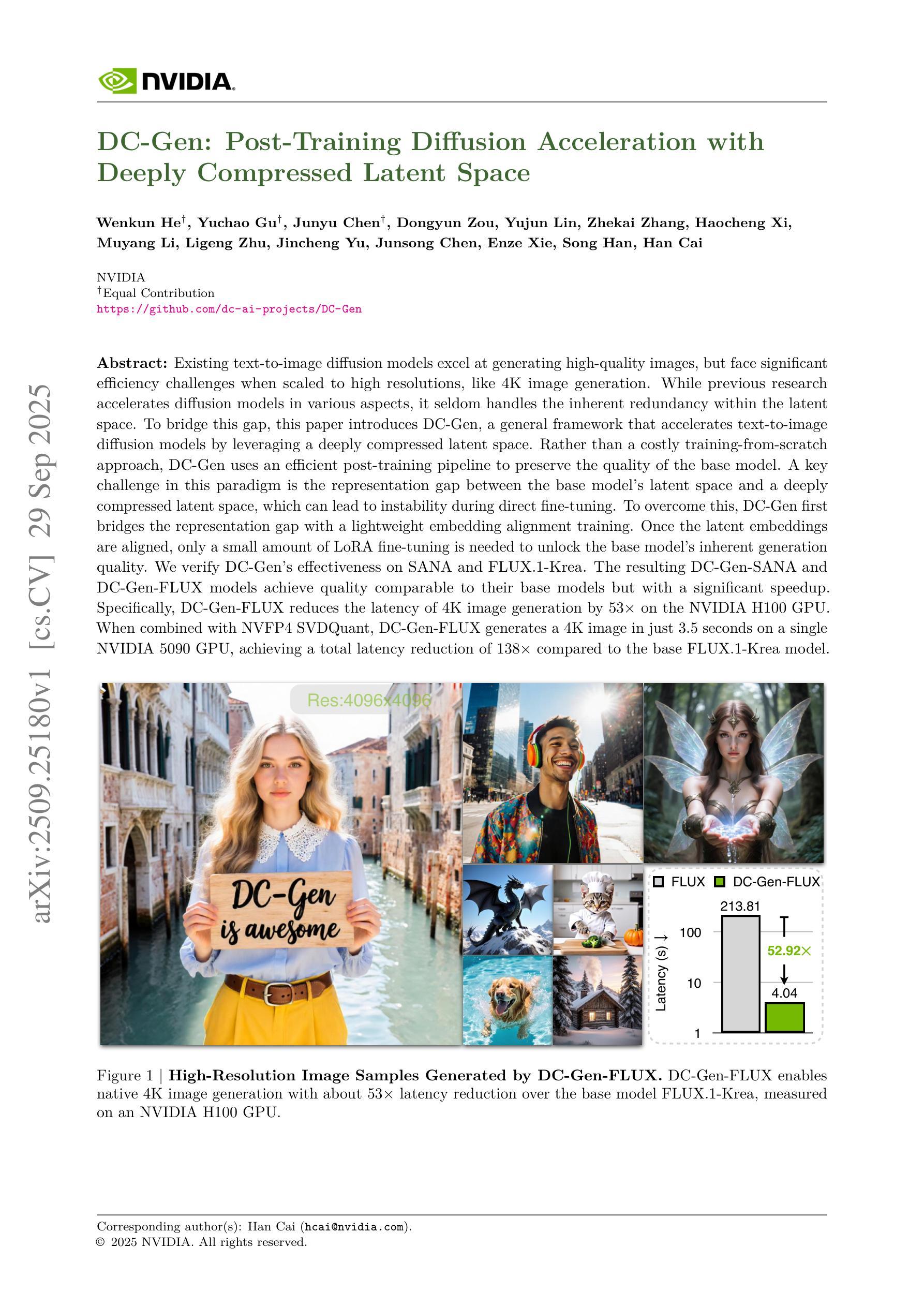 Existing text-to-image diffusion models excel at generating high-quality images, but face significant efficiency challenges when scaled to high resolutions, like 4K image generation. While previous research accelerates diffusion models in various aspects, it seldom handles the inherent redundancy within the latent space. To bridge this gap, this paper introduces DC-Gen, a general framework that accelerates text-to-image diffusion models by leveraging a deeply compressed latent space. Rather than a costly training-from-scratch approach, DC-Gen uses an efficient post-training pipeline to preserve the quality of the base model. A key challenge in this paradigm is the representation gap between the base model’s latent space and a deeply compressed latent space, which can lead to instability during direct fine-tuning. To overcome this, DC-Gen first bridges the representation gap with a lightweight embedding alignment training. Once the latent embeddings are aligned, only a small amount of LoRA fine-tuning is needed to unlock the base model’s inherent generation quality. We verify DC-Gen’s effectiveness on SANA and FLUX.1-Krea. The resulting DC-Gen-SANA and DC-Gen-FLUX models achieve quality comparable to their base models but with a significant speedup. Specifically, DC-Gen-FLUX reduces the latency of 4K image generation by 53x on the NVIDIA H100 GPU. When combined with NVFP4 SVDQuant, DC-Gen-FLUX generates a 4K image in just 3.5 seconds on a single NVIDIA 5090 GPU, achieving a total latency reduction of 138x compared to the base FLUX.1-Krea model. Code: https://github.com/dc-ai-projects/DC-Gen.