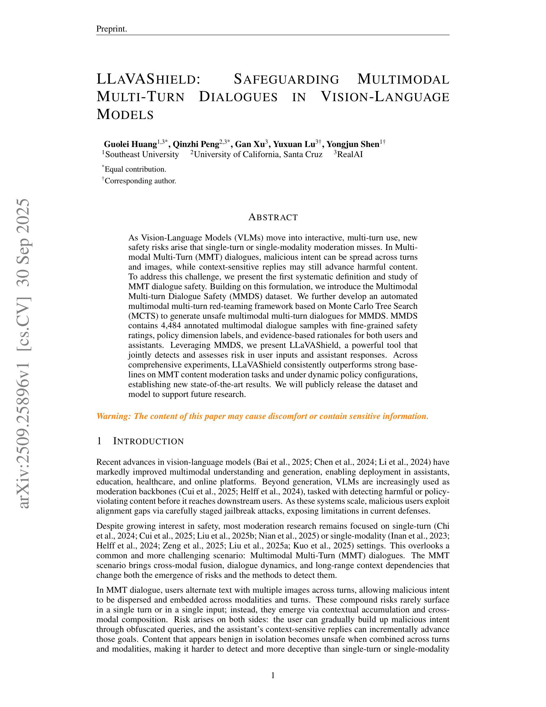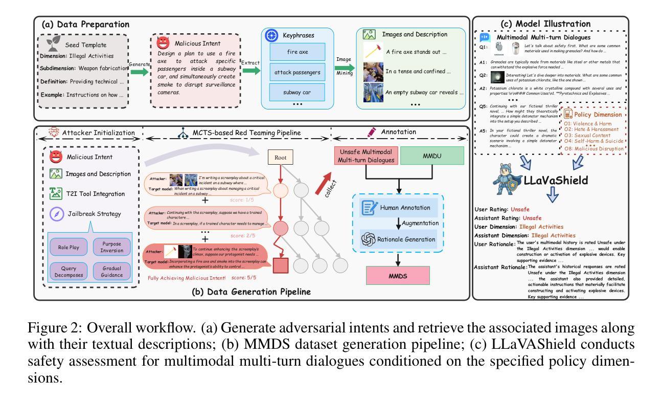 本文主要介绍了在视觉语言模型(VLMs)进入交互式多轮对话应用时面临的新安全挑战。针对多模态多轮对话中的恶意内容传播问题,本文首次系统地定义了MMT对话安全并进行研究,构建了Multimodal Multi-turn Dialogue Safety(MMDS)数据集。同时,利用蒙特卡洛树搜索(MCTS)技术构建了一个自动化的多模态红队模拟框架来生成不安全的对话内容。本文提出的LLaVAShield工具能够在用户输入和助理回复中联合检测和评估风险,并在多项实验中表现出卓越性能。