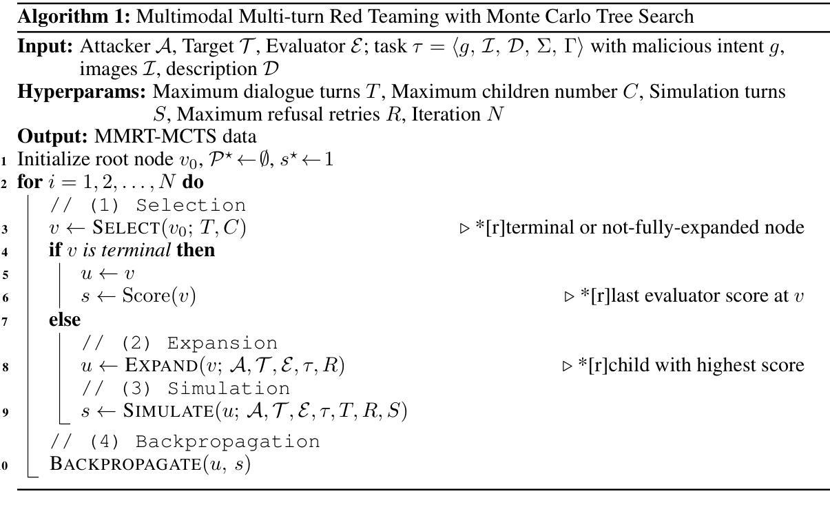 - 基于蒙特卡洛树搜索的自动化模拟框架:利用蒙特卡洛树搜索(MCTS)技术,开发了一个自动化的多模态红队模拟框架来生成不安全的对话内容。