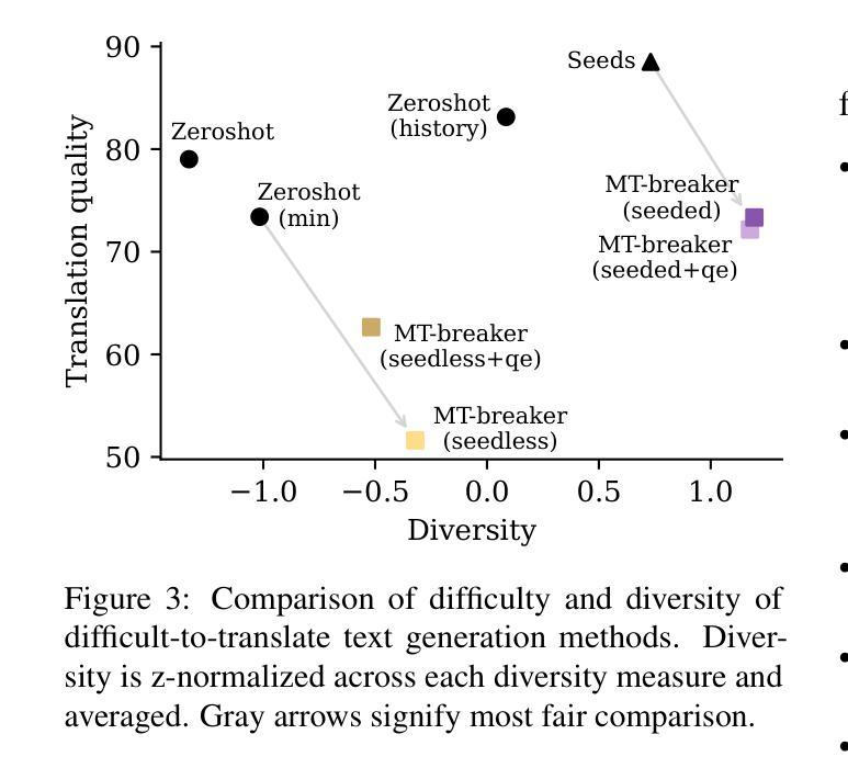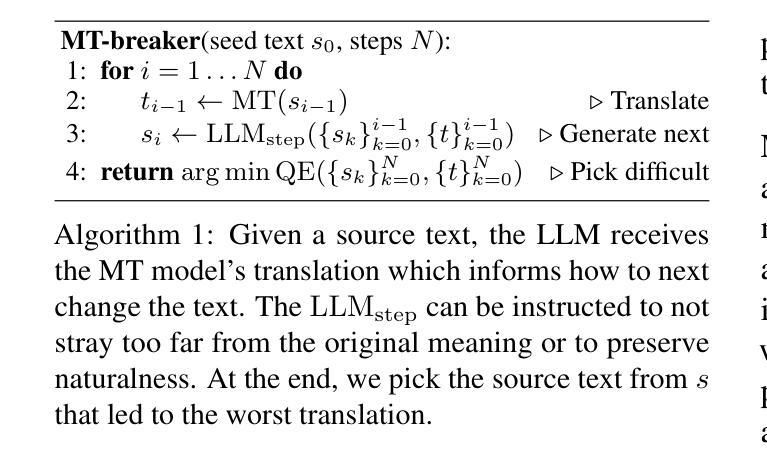 现实世界来源的机器翻译基准测试由于大多数实例对于最先进的翻译模型来说过于简单而很快被淘汰。这限制了基准测试区分哪个模型更好或揭示模型弱点的能力。当前创建困难测试用例的方法,如子采样或从头开始合成,要么不能识别出困难的例子,要么缺乏多样性和自然性。受人类专家探测模型失败过程的启发,我们提出MT-breaker方法,这是一种大型语言模型通过迭代优化源文本来增加其翻译难度的方法。大型语言模型迭代地查询目标机器翻译模型,以指导其生成困难的例子。我们的方法为目标机器翻译模型生成更具挑战性的例子,同时保持自然文本的多样性。虽然这些例子是在生成过程中针对特定的机器翻译模型定制的,但难度也会转移到其他模型和语言上。