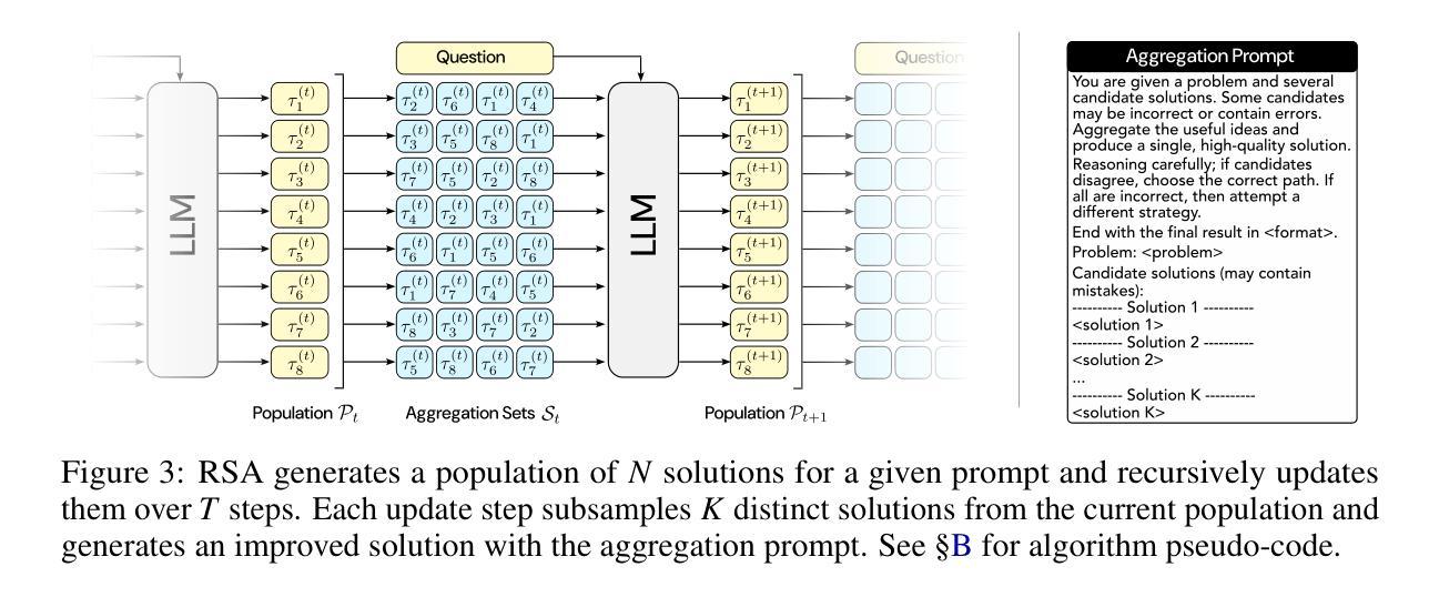 - RSA通过与大型推理模型比较展现出竞争力,例如DeepSeek-R1和o3-mini。