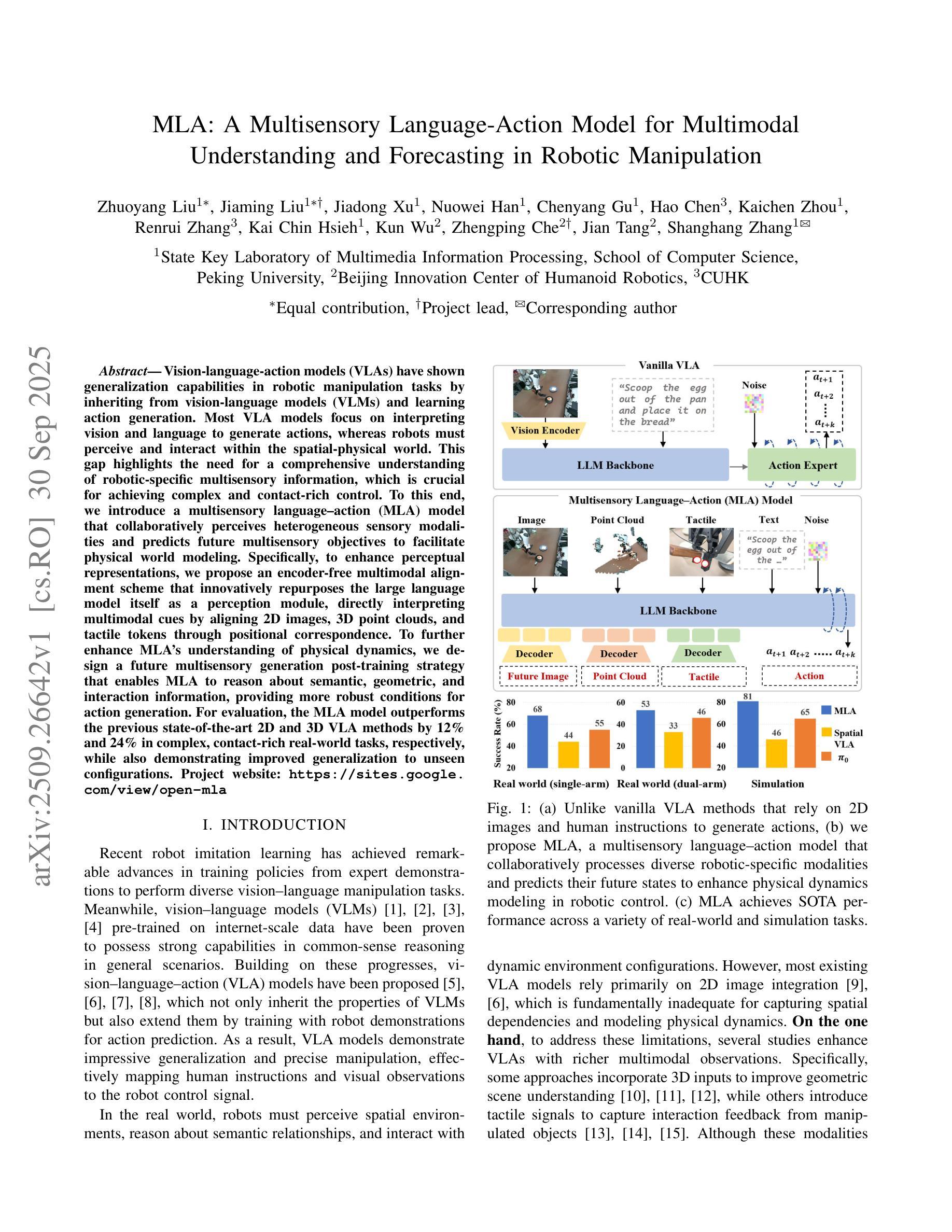 视觉语言行动模型(VLAs)通过继承视觉语言模型(VLMs)并学习行动生成,在机器人操作任务中表现出了泛化能力。大多数VLA模型侧重于解释视觉和语言以生成行动,而机器人必须在空间物理世界中进行感知和交互。这一差距凸显了对机器人特定多感官信息的全面理解的需求,这对于实现复杂且接触丰富的控制至关重要。为此,我们引入了一种多感官语言行动(MLA)模型,该模型可以协同感知不同的感官模式,并预测未来的多感官目标,以促进物理世界建模。具体来说,为了增强感知表示,我们提出了一种无编码器多模态对齐方案,该方案创新地将大型语言模型本身重新用作感知模块,通过位置对应关系直接解释多模态线索,对齐2D图像、3D点云和触觉标记。为了进一步增强MLA对物理动态的理解,我们设计了一种未来多感官生成后训练策略,使MLA能够推理语义、几何和交互信息,为行动生成提供更稳健的条件。在评估中,MLA模型在复杂、接触丰富的真实世界任务中分别比最新的2D和3DVLA方法高出12%和24%,同时显示出对未见配置的改进泛化能力。项目网站:https://sites.google.com/view/open-mla