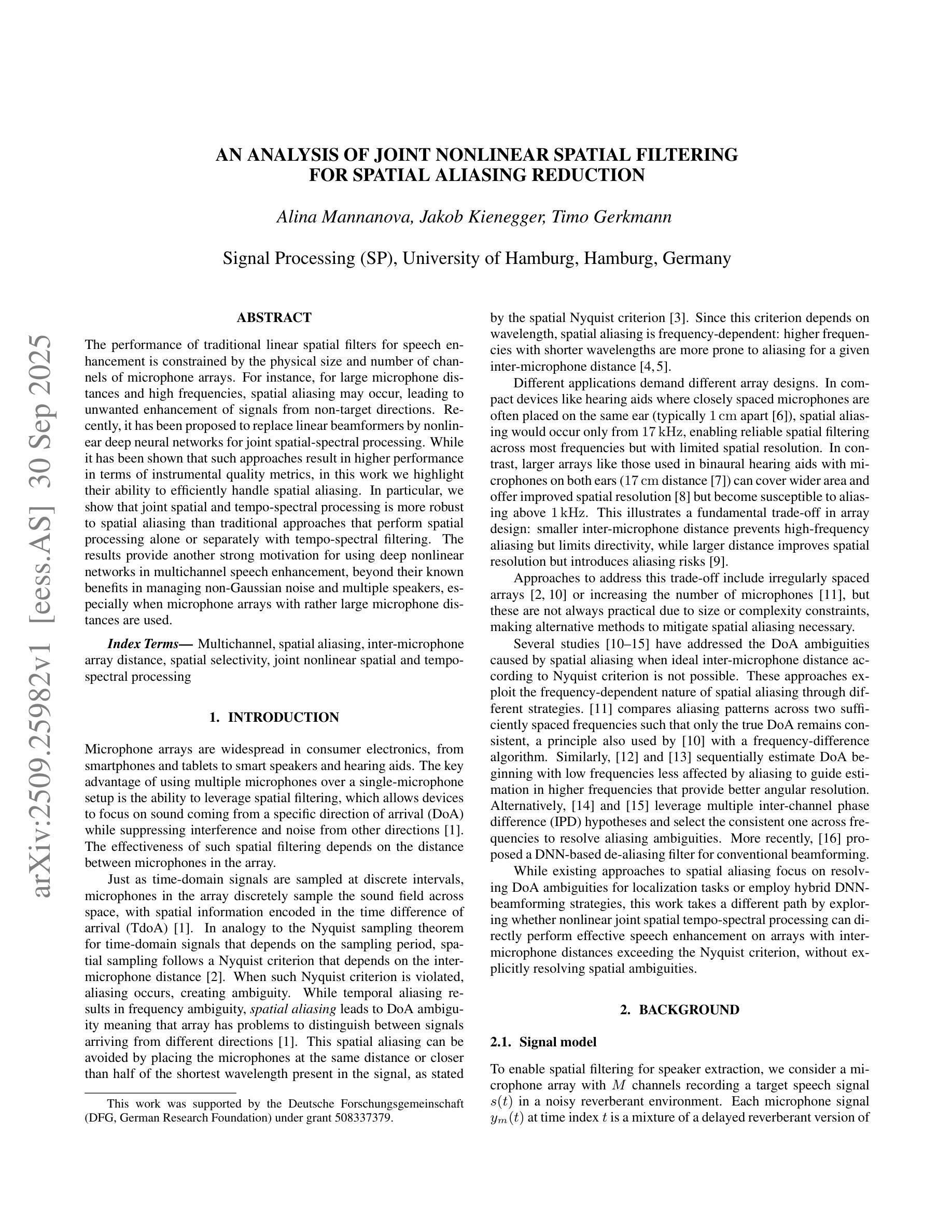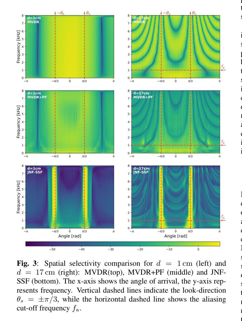 传统的线性空间滤波器在进行语音增强时的性能受限于麦克风阵列的物理尺寸和通道数量。在大麦克风距离和高频情况下,会发生空间混叠,导致非目标方向信号的意外增强。最近提议用非线性深度神经网络替代线性波束形成器进行联合空间光谱处理。虽然已证明这些方法在仪器质量指标方面表现更好,但在这项工作中,我们重点强调了它们处理空间混叠的能力。特别是,我们显示联合空间和时序光谱处理比传统方法更稳健对抗空间混叠,后者单独或分别进行时频滤波处理。结果除了它们在管理非高斯噪声和多说话人方面的已知优势外,还提供了在多通道语音增强中使用深度非线性网络的另一个强烈动机,特别是在使用间距较大的麦克风阵列时更是如此。