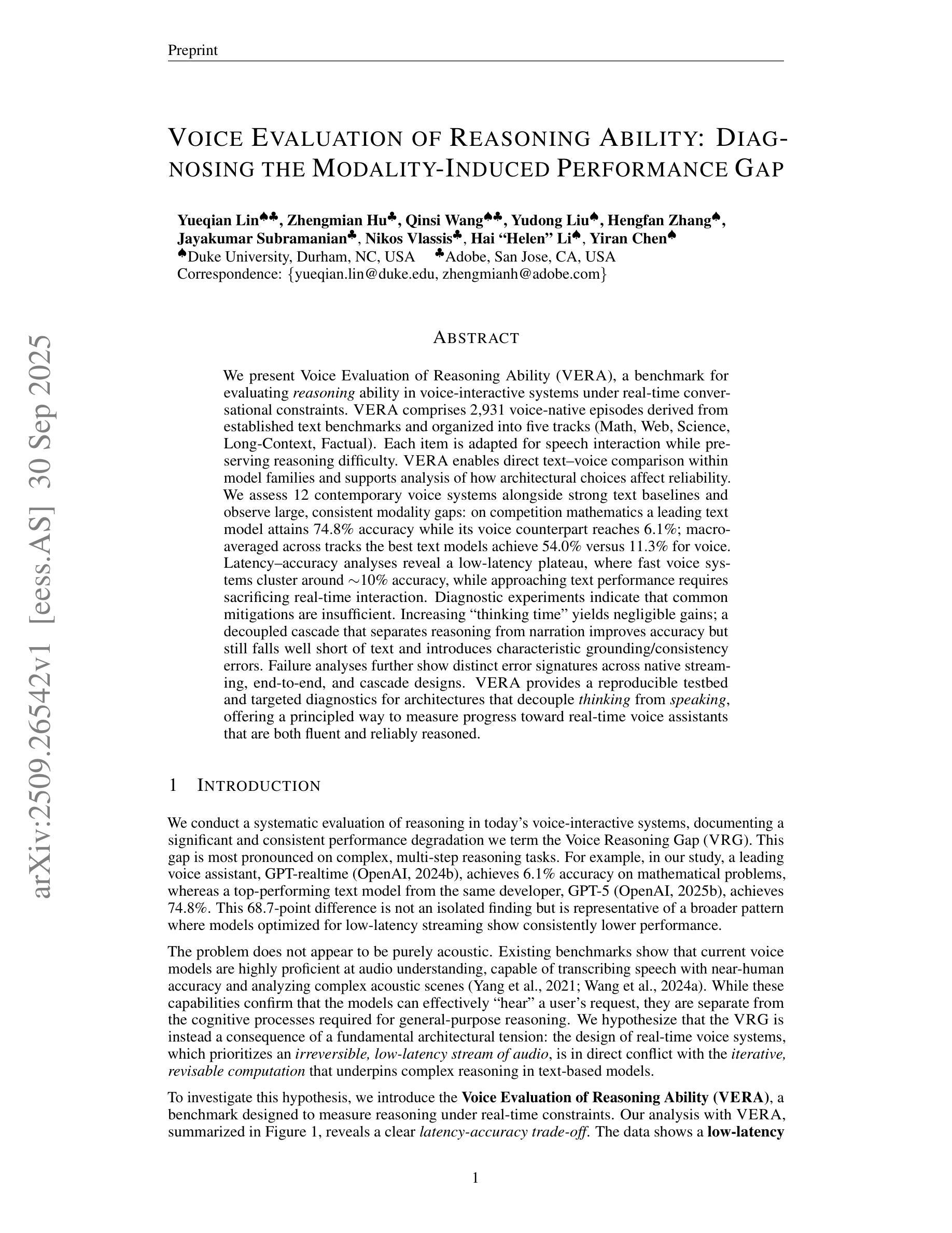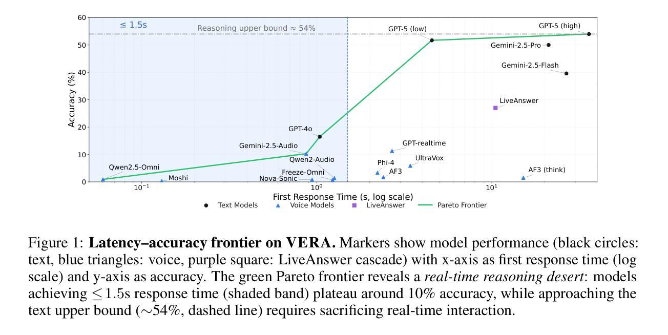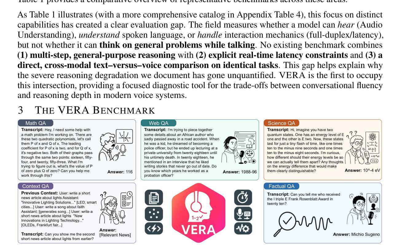 我们推出了语音推理能力评估(VERA),这是一个基准测试,用于评估实时对话约束下语音交互系统中的推理能力。VERA包含从既定文本基准测试中得出的2931个原生语音片段,这些片段被组织成五个赛道(数学、网络、科学、长语境、事实)。每个项目都适应语音交互,同时保留推理难度。VERA能够在模型家族内进行直接的文本语音比较,并支持分析架构选择如何影响可靠性。我们评估了12个当代语音系统以及强大的文本基准,并观察到了一致且显著的模态差距:在数学竞赛中,领先的文本模型达到74.8%的准确率,而其语音对应模型只达到6.1%;跨赛道的宏观平均,最佳文本模型达到54.0%,而语音模型为11.3%。延迟-准确性分析显示了一个低延迟平台,在这个平台上,快速语音系统聚集在约10%的准确率,而要达到文本性能则需要牺牲实时交互。诊断实验表明常见的缓解措施并不足够。增加“思考时间”产生的收益微乎其微;一个分离的级联,将推理与叙述分开,可以提高准确性,但仍远远落后于文本,并引入典型的接地/一致性错误。故障分析进一步显示了原生流媒体、端到端和级联设计之间的不同错误签名。VERA为脱离思考和说话过程的架构提供了一个可重复的测试平台和有针对性的诊断,为实时语音助手提供了一-种既有流利度又可靠推理的衡量进步的原则性方法。