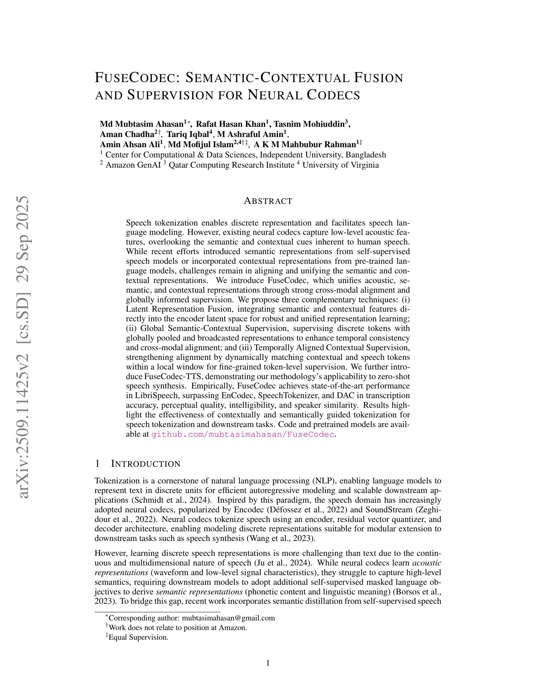 Speech tokenization enables discrete representation and facilitates speech language modeling. However, existing neural codecs capture low-level acoustic features, overlooking the semantic and contextual cues inherent to human speech. While recent efforts introduced semantic representations from self-supervised speech models or incorporated contextual representations from pre-trained language models, challenges remain in aligning and unifying the semantic and contextual representations. We introduce FuseCodec, which unifies acoustic, semantic, and contextual representations through strong cross-modal alignment and globally informed supervision. We propose three complementary techniques: (i) Latent Representation Fusion, integrating semantic and contextual features directly into the encoder latent space for robust and unified representation learning; (ii) Global Semantic-Contextual Supervision, supervising discrete tokens with globally pooled and broadcasted representations to enhance temporal consistency and cross-modal alignment; and (iii) Temporally Aligned Contextual Supervision, strengthening alignment by dynamically matching contextual and speech tokens within a local window for fine-grained token-level supervision. We further introduce FuseCodec-TTS, demonstrating our methodology’s applicability to zero-shot speech synthesis. Empirically, FuseCodec achieves state-of-the-art performance in LibriSpeech, surpassing EnCodec, SpeechTokenizer, and DAC in transcription accuracy, perceptual quality, intelligibility, and speaker similarity. Results highlight the effectiveness of contextually and semantically guided tokenization for speech tokenization and downstream tasks. Code and pretrained models are available at https://github.com/mubtasimahasan/FuseCodec.