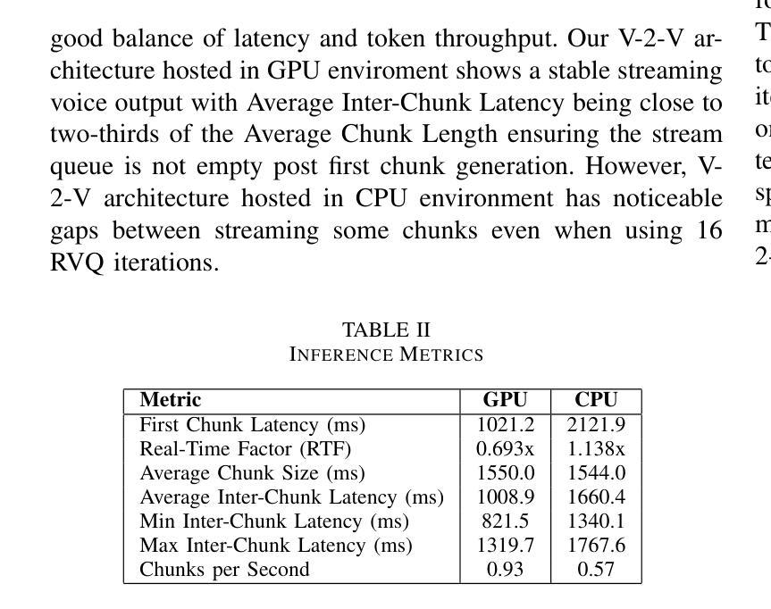 PDF This paper analyzes a low-latency, end-to-end voice-to-voice (V-2-V) architecture, identifying that the Text-to-Speech (TTS) component has the highest impact on real-time performance. By reducing the number of Residual Vector Quantization (RVQ) iterations in the TTS model, latency can be effectively halved. Its accepted at AIML Systems 2025