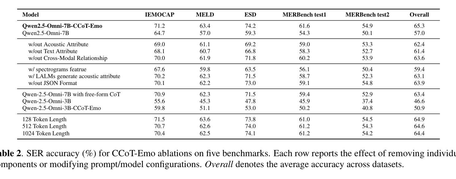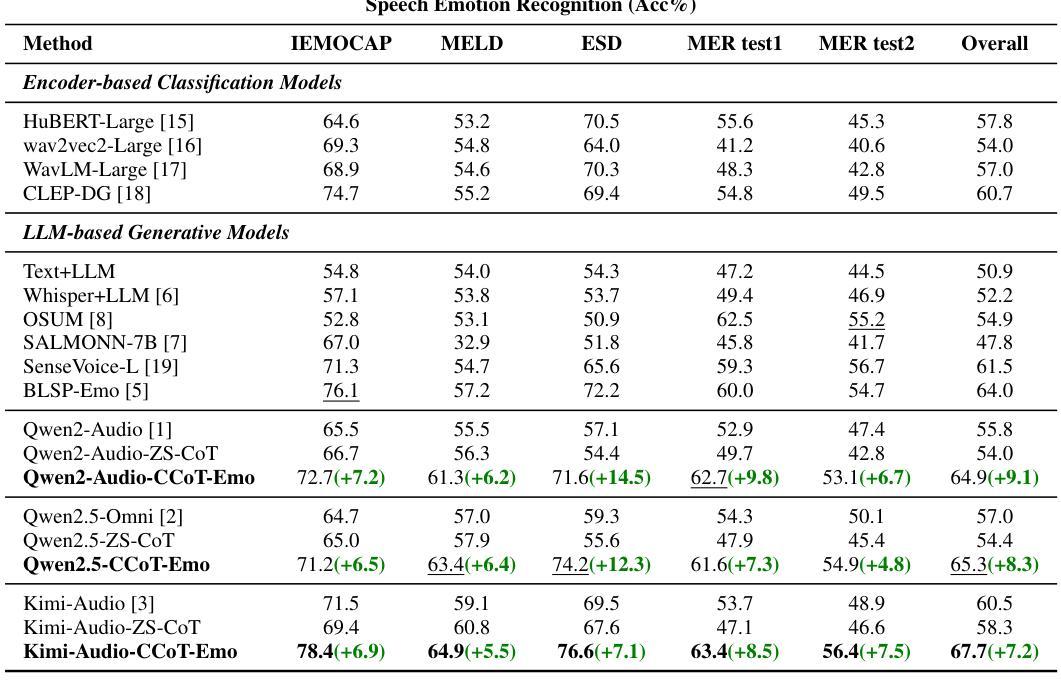 - 实验结果表明,CCoT-Emo在SER基准测试中表现优于先前的方法。
