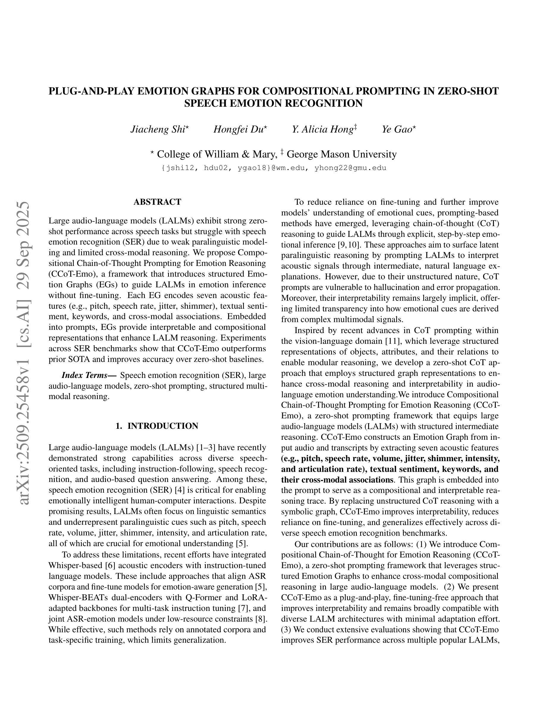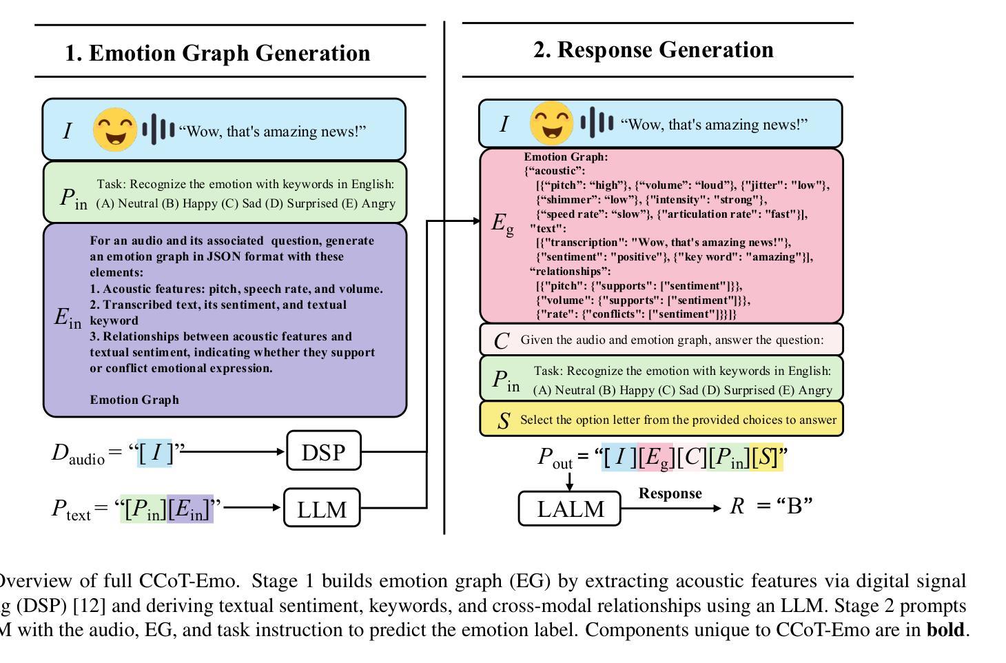 大型音频语言模型(LALM)在语音任务中表现出强大的零样本性能,但由于缺乏副语言建模和有限的跨模态推理,在语音情感识别(SER)方面遇到了困难。我们提出了面向情感推理的组成思维链提示(CCoT-Emo)框架,该框架引入结构化情感图(EG)来指导LALM进行情感推断,而无需微调。每个情感图编码七种声学特征(例如音调、语速、抖动、颤音)、文本情感、关键词和跨模态关联。嵌入到提示中,情感图提供可解释和组合表示,增强了LALM推理。在SER基准测试上的实验表明,CCoT-Emo优于先前最佳技术,并提高了零样本基准测试的准确性。