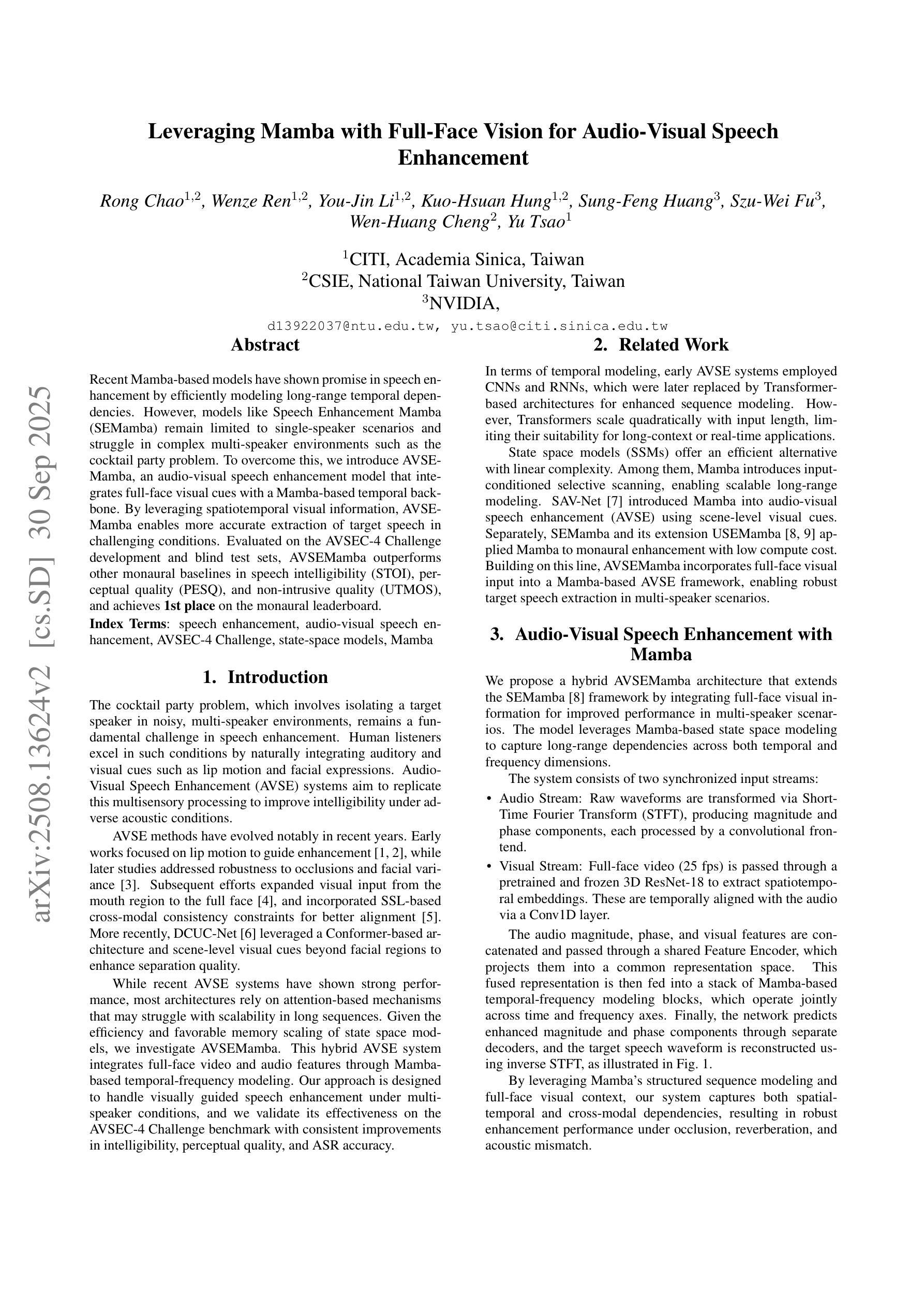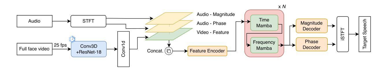 - AVSEMamba是一个音频视觉语音增强模型,融合了面部视觉线索和Mamba的时序主干网络。