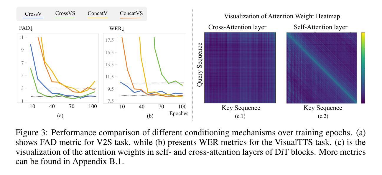 视频条件的声音和语音生成,包括视频到声音(V2S)和视觉文本到语音(VisualTTS)任务,传统上被视为单独的任务,并且在统一框架内对其进行探索的尝试有限。最近尝试将V2S和VisualTTS统一起来,在处理不同的条件类型(例如,不同的视频和文本条件)方面面临挑战,并且需要复杂的训练阶段。统一这两个任务仍然是一个悬而未决的问题。为了弥合这一差距,我们提出了VSSFlow,它无缝地将V2S和VisualTTS任务集成到一个统一的流匹配框架中。VSSFlow使用了一种新型的条件聚合机制来处理不同的输入信号。我们发现,在引入条件的过程中,跨注意力和自注意力层表现出不同的归纳偏置。因此,VSSFlow利用这些归纳偏置来有效地处理不同的表示形式:跨注意力用于模糊的视频条件,自注意力用于更确定的语音文本。此外,与我们普遍认为的联合训练这两个任务需要复杂的训练策略并可能降低性能相反,我们发现VSSFlow受益于声音和语音生成的端到端联合学习过程,而无需在训练阶段进行额外设计。详细分析将其归因于任务之间学到的共享通用音频先验,这加速了收敛,增强了条件生成,并稳定了无分类器指导过程。大量实验表明,VSSFlow超越了V2S和VisualTTS基准测试领域的最新技术,突显出统一生成模型的关键潜力。