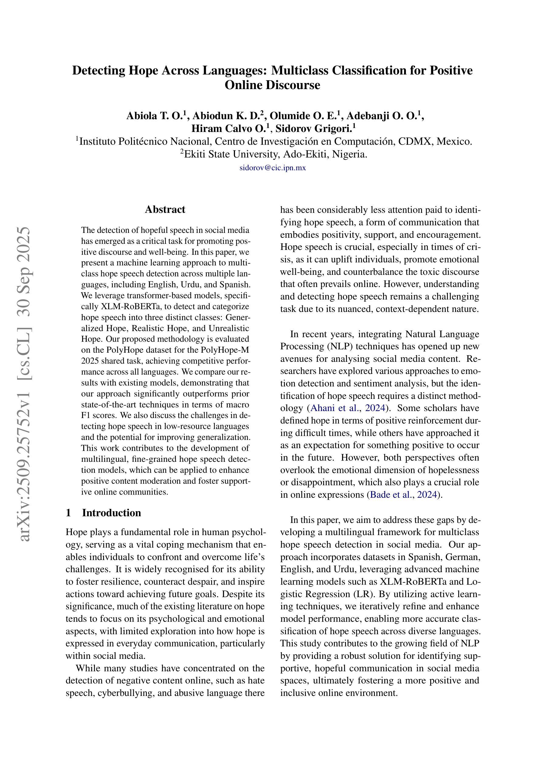 社交媒体中希望言论的检测对促进积极对话和心理健康至关重要。本文提出一种跨多种语言的希望言论机器学习检测方案,包括英语、乌尔都语和西班牙语。我们利用基于transformer的模型XLM-RoBERTa来检测和分类希望言论为三种不同类别:通用型希望、现实型希望和幻想型希望。该方法在PolyHope数据集上针对PolyHope-M 2025共享任务进行评估,所有语言上的表现均表现优异。相较于现有模型,我们的方法在提高宏观F1分数方面显著优于先前最先进的技巧。我们还讨论了在低资源语言中检测希望言论的挑战以及提高泛化能力的潜力。本研究为开发多语言、精细化的希望言论检测模型做出贡献,可应用于增强积极内容管理和促进支持性在线社区。