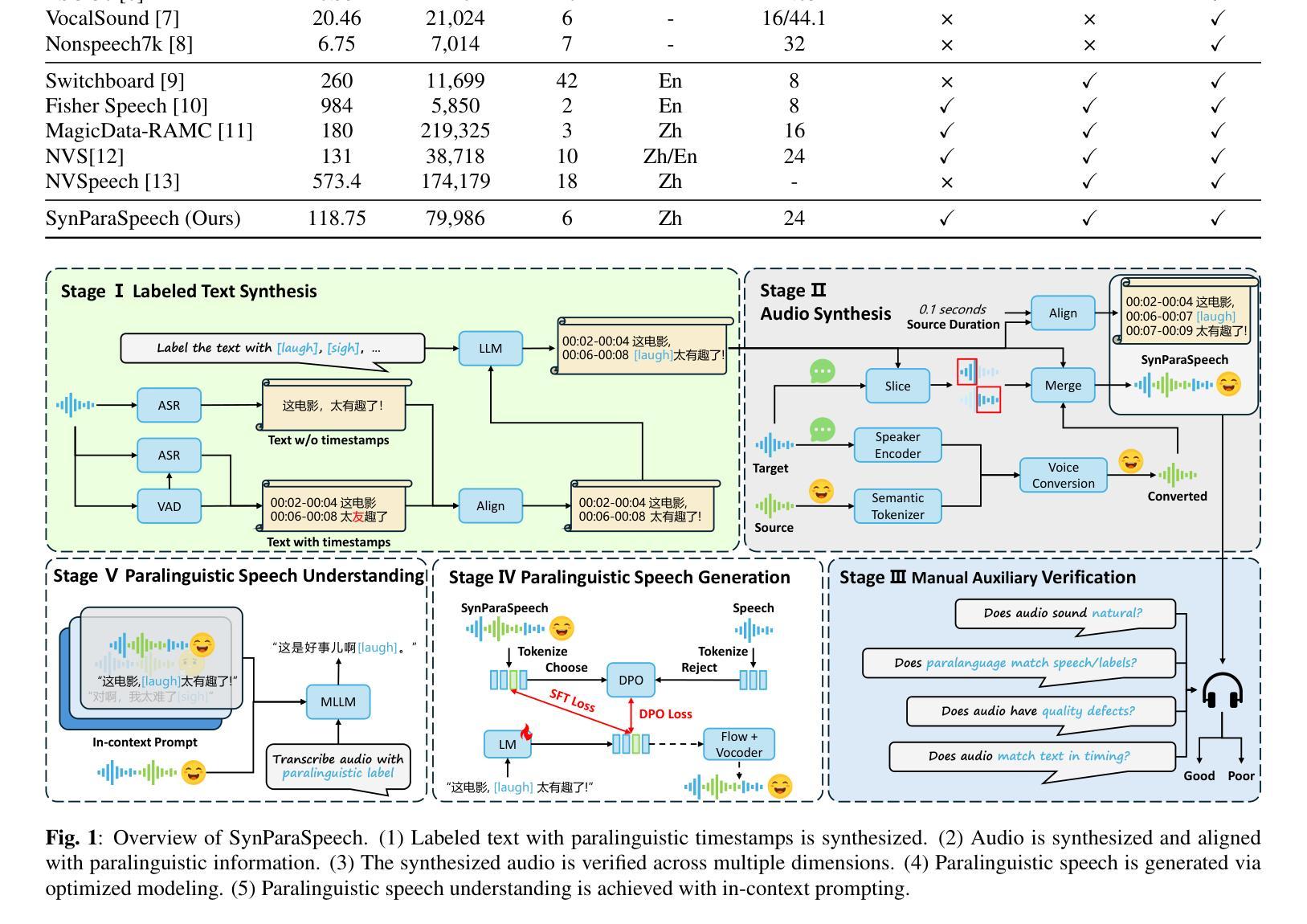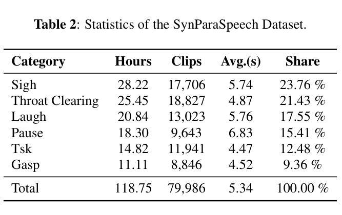 - 构建了包含6个副语言类别、118.75小时数据和精确时间戳的SynParaSpeech数据集。