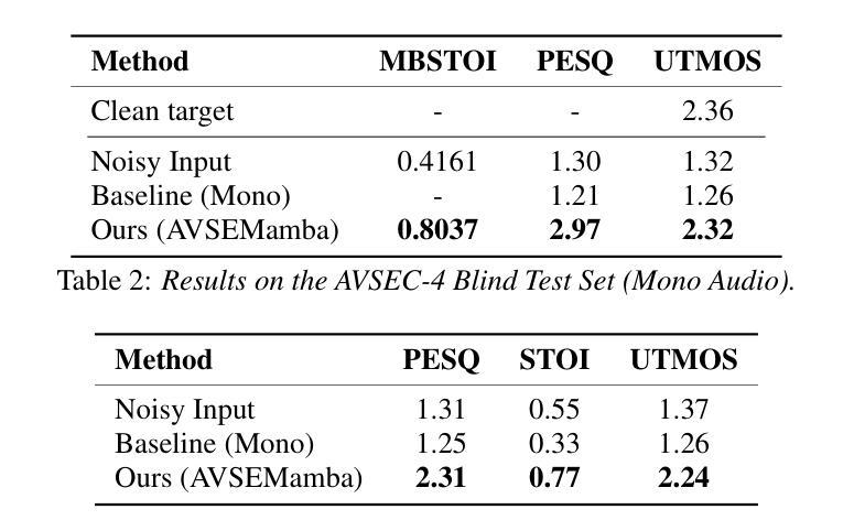 - AVSEMamba在语音清晰度、感知质量和非侵入质量方面表现优秀。