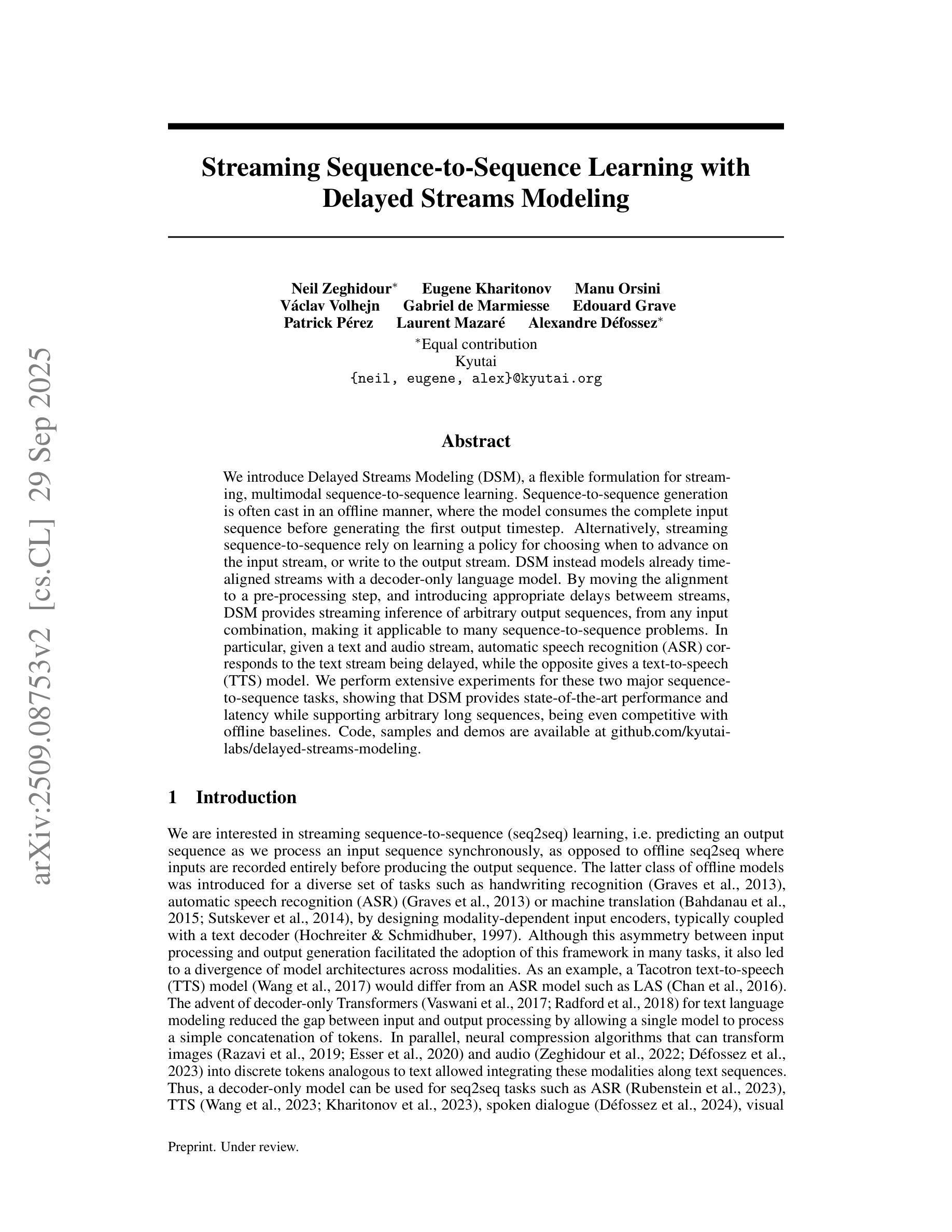 本文介绍了延迟流建模(DSM),这是一种用于流式、多模态序列到序列学习的灵活方法。与传统的离线序列到序列生成不同,DSM对已经时间对齐的流进行建模,通过预处理步骤完成对齐,并在流之间引入适当的延迟,以实现任意输出序列的流式推断。这种方法适用于许多序列到序列问题,包括语音识别和文本到语音转换。实验表明,DSM具有最先进的性能和低延迟,支持任意长序列,与离线基准测试具有竞争力。