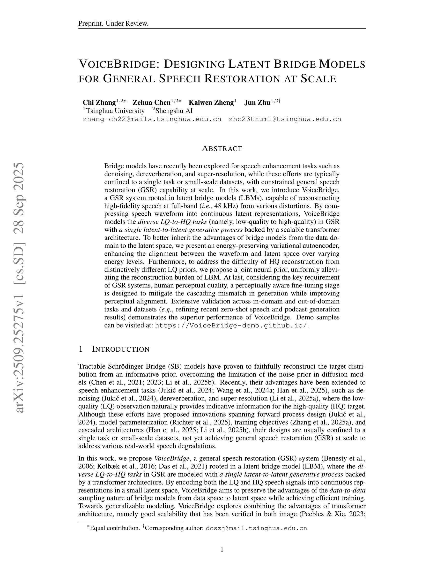 本文介绍了基于潜在桥梁模型(LBMs)的VoiceBridge系统,用于通用语音恢复(GSR)。该系统能够重建高质量的全频带语音,并具有从各种失真中恢复语音的能力。通过压缩语音波形到连续的潜在表示,VoiceBridge用一个潜在到潜在生成过程对各种低质量到高质量的任务进行建模。通过引入能量保持变分自编码器,增强波形和潜在空间之间在不同能量水平上的对齐。针对从独特低质量先验重构高质量语音的困难,提出了一种联合神经先验,减轻了LBM的重构负担。最后,考虑到GSR系统的关键需求——人类感知质量,设计了一个感知意识微调阶段,以缓解生成过程中的级联不匹配问题,同时提高感知对齐。在跨领域任务和数据集上的广泛验证表明VoiceBridge的卓越性能。