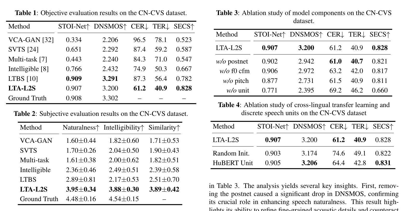 针对普通话的唇动到语音合成(L2S)存在挑战,主要由于复杂的唇动到音素映射以及词汇音调在可理解性中的关键作用。我们提出了词汇音调感知的唇动到语音合成(LTA-L2S)来解决这一问题。我们的模型通过跨语言迁移学习策略,借鉴英语预训练的音频视觉自我监督学习(SSL)模型来解决音素映射的复杂性。这一策略不仅将通用知识从大量的英语数据转移到普通话领域,而且避免了从头开始训练此类模型的昂贵成本。为了专门建模词汇的音调并增强可理解性,我们进一步采用流匹配模型来生成F0轮廓。这一生成过程由ASR微调SSL语音单元引导,这些单元包含关键的超分段信息。总体而言,通过两阶段训练模式提高语音质量,第一阶段产生的粗略频谱图通过流匹配后网进行细化。实验表明,LTA-L2S在语音可理解性和音调准确性方面均显著优于现有方法。