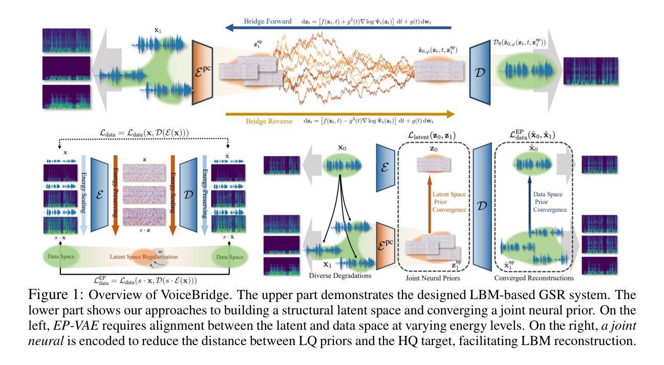 最近,桥梁模型已被探索用于语音增强任务,如去噪、消除回声和超分辨率。然而,这些努力通常局限于单一任务或小规模数据集,大规模通用语音恢复(GSR)能力受限。在这项工作中,我们引入了VoiceBridge,这是一个基于潜在桥梁模型(LBM)的GSR系统,能够从各种失真中重建全频带(即48kHz)的高保真语音。通过将语音波形压缩成连续潜在表示,VoiceBridge用一个潜在空间到潜在空间的生成过程来模拟GSR中的多种LQ-to-HQ任务(即从低质量到高质量)。为了更好地从数据域继承桥梁模型的优势到潜在空间,我们提出了一种能量保持式变分自动编码器,增强了波形和潜在空间在不同能量水平上的对齐。此外,为了解决从明显不同的LQ先验中进行HQ重建的困难,我们提出了一个联合神经先验,统一缓解了LBM的重建负担。最后,考虑到GSR系统的关键需求——人类感知质量,设计了一个感知意识微调阶段,旨在减轻生成过程中的级联不匹配问题,同时提高感知对齐。在域内和域外任务和数据集上的广泛验证(例如,改进最近的零样本语音和播客生成结果)表明VoiceBridge的卓越性能。演示样品可访问:https://VoiceBridge-demo.github.io/。