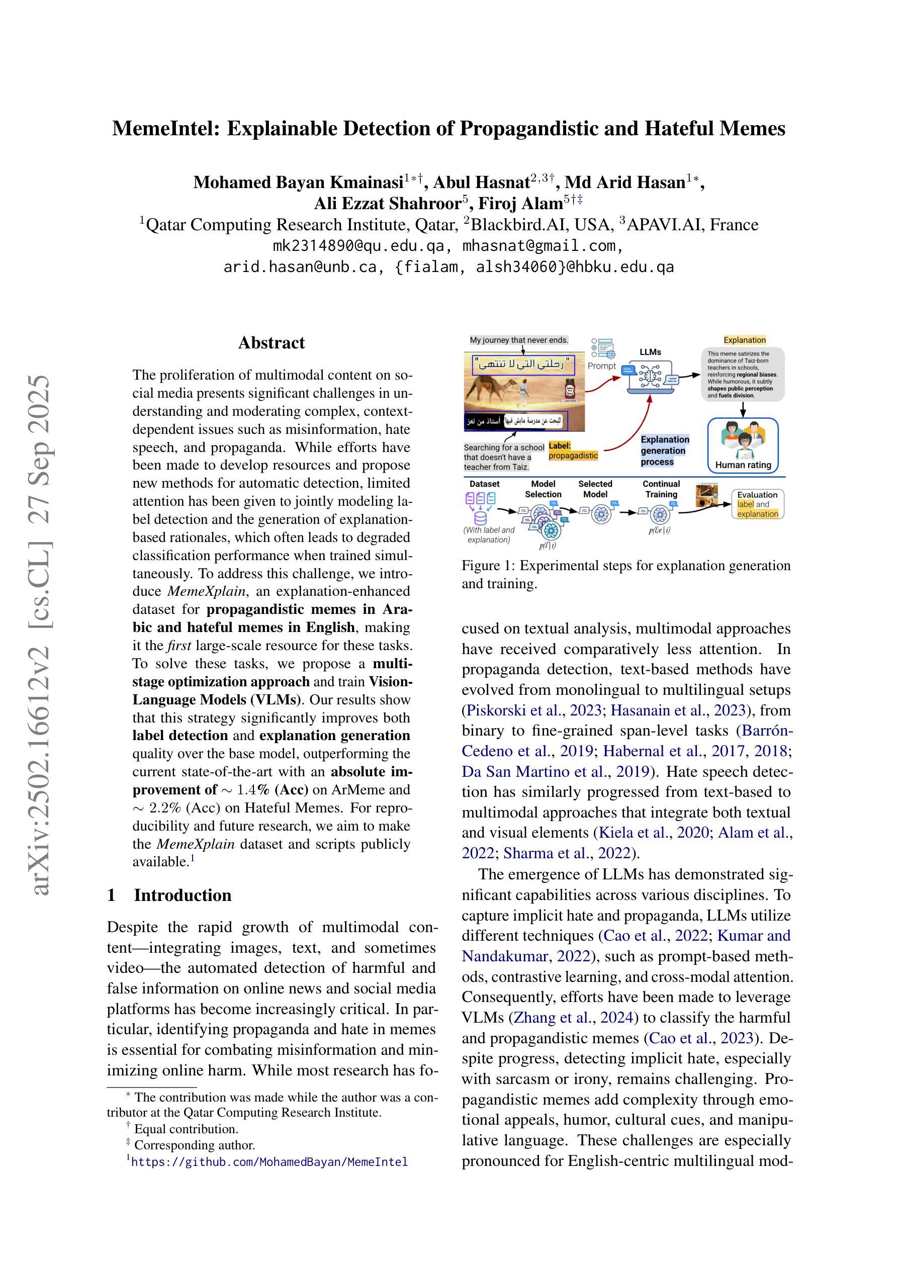 社交媒体上多模态内容的激增,为理解和调节复杂、依赖语境的问题(如错误信息、仇恨言论和宣传)带来了重大挑战。尽管已有一些自动检测资源的开发和新方法的提出,但在联合建模标签检测和基于解释的理性生成方面关注较少,这往往导致同时训练时分类性能下降。为应对这一挑战,我们推出了MemeXplain数据集,包含阿拉伯语的宣传性meme和英语的仇恨性meme,成为首个大规模资源用于这些任务。为解决这些任务,我们提出了多阶段优化方法并训练了视觉语言模型(VLMs)。结果显示,此策略在标签检测和解释生成质量上均显著提高了基础模型性能,相较于当前最先进技术,在ArMeme上准确率提高了约1.4%,在仇恨性Memes上准确率提高了约2.2%。我们旨在让MemeXplain数据集和脚本公开可用,以供未来研究(https://github.com/MohamedBayan/MemeIntel)。