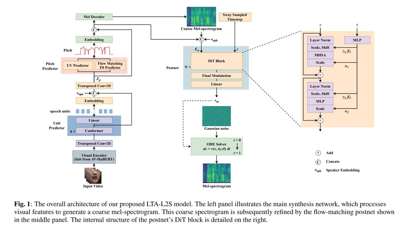 针对普通话的唇音到语音(L2S)合成是一个重大挑战,受到复杂唇动到音素映射以及词汇音在可理解性中的关键作用的阻碍。为了解决这个问题,我们提出了词汇音感知的唇音到语音(LTA-L2S)合成方法。为了解决唇动到音素的复杂性,我们的模型通过跨语言迁移学习策略,对一个英语预训练的音频视觉自我监督学习(SSL)模型进行适配。这一策略不仅将从大量英语数据中学习到的通用知识转移到普通话领域,而且避免了从头开始训练此类模型的昂贵成本。为了专门建模词汇音并增强可理解性,我们进一步采用流匹配模型来生成F0轮廓。这一生成过程由经过ASR精细调整的SSL语音单元引导,这些单元包含关键的超音段信息。通过两阶段训练范式,整体语音质量得到提升,其中流匹配后网络对第一阶段产生的粗糙频谱图进行细化。大量实验表明,LTA-L2S在语音可理解性和音调准确性方面都显著优于现有方法。