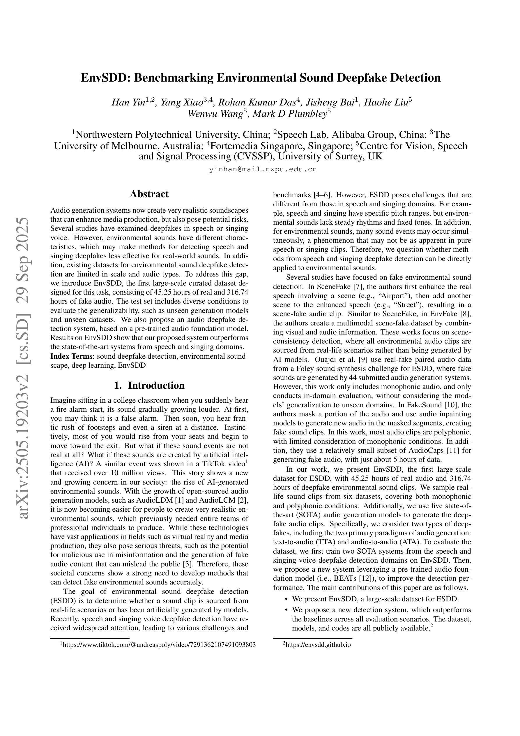 - 推出EnvSDD数据集,用于专门的环境声音深度伪造检测任务。