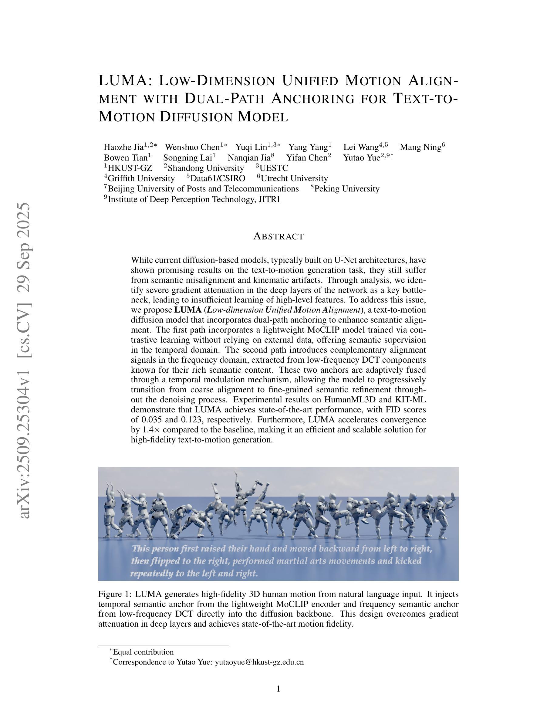 当前基于扩散模型(通常基于U-Net架构)在文本到运动生成任务上取得了有前景的结果,但它们仍存在语义不对齐和运动学伪影的问题。通过分析,我们确定了网络深层中的严重梯度衰减是这一瓶颈的关键原因,导致对高级特征的学习不足。为了解决这个问题,我们提出了文本到运动扩散模型LUMA(Low-dimension Unified Motion Alignment)。该模型结合了双路径锚定技术以增强语义对齐。第一个路径采用轻量级MoCLIP模型,通过对比学习进行训练,无需依赖外部数据,在时序域内提供语义监督。第二个路径引入了丰富的语义内容的低频DCT分量来提取频率域的互补对齐信号。这两个锚通过自适应的时间调制机制进行融合,使模型能够在去噪过程中逐步从粗略对齐过渡到精细的语义细化。在人类ML3D和KIT-ML上的实验结果表明,LUMA达到了业界最佳性能,FID得分分别为0.035和0.123。此外,与基线相比,LUMA加速了收敛速度,达到了原来的1.4倍,使其成为高效且可扩展的解决方案,用于高保真文本到运动生成。