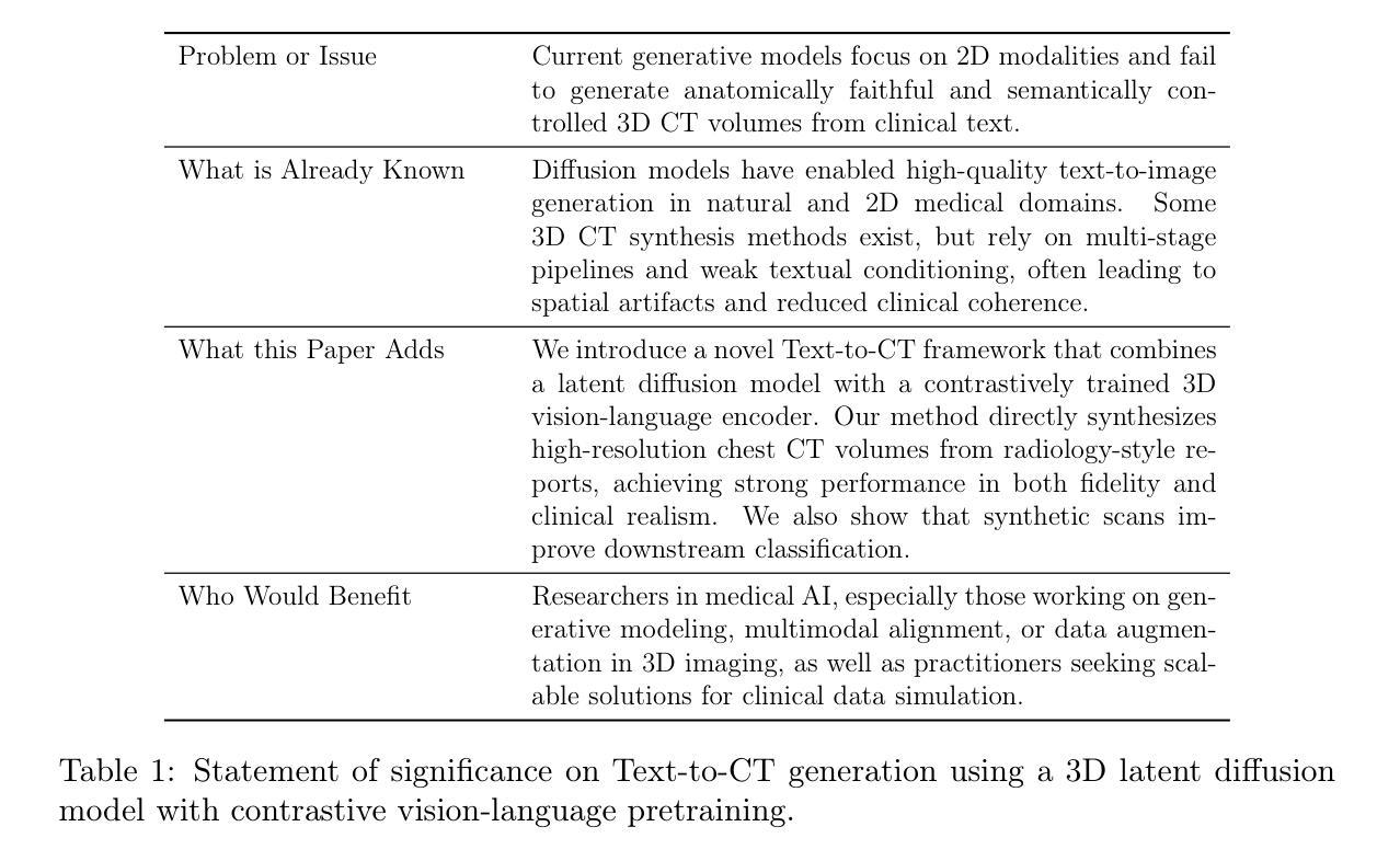 - 本研究实现了文本驱动的三维医学图像生成,突破了先前主要局限于二维模态的挑战。