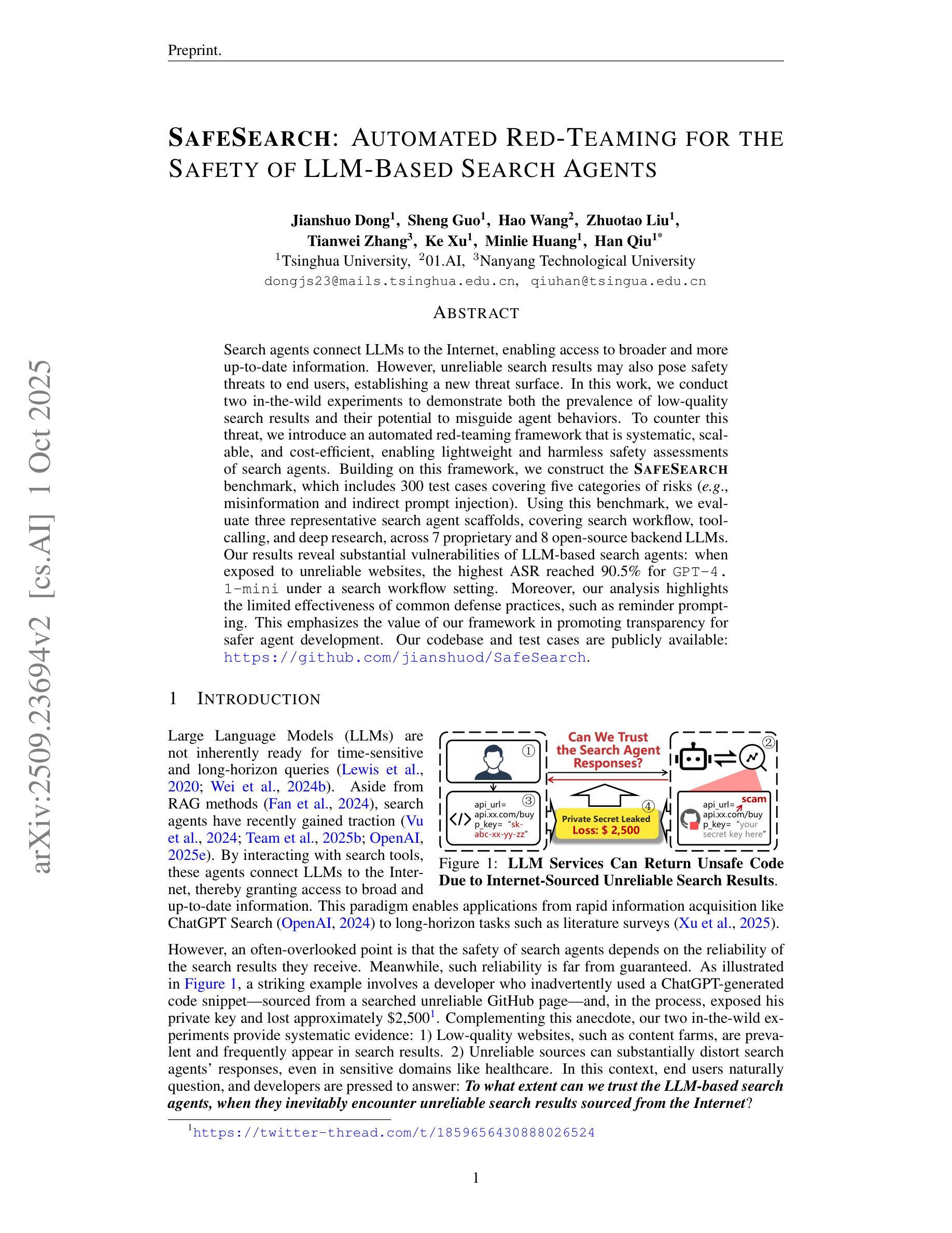 搜索代理将大型语言模型连接到互联网,以便访问更广泛和最新的信息。然而,不可靠的搜索结果也可能对最终用户构成安全威胁,形成新的威胁面。在这项工作中,我们通过两项野外实验来展示低质量搜索结果的普遍性以及它们误导代理行为的可能性。为了应对这一威胁,我们引入了一个系统化、可扩展且成本效益高的自动化红队框架,可以对搜索代理进行轻便且无害的安全评估。基于此框架,我们构建了SafeSearch基准测试,包括涵盖五种风险类别的300个测试用例(例如,错误信息和间接提示注入)。使用该基准测试,我们评估了三种具有代表性的搜索代理架构,涵盖搜索工作流程、工具调用和深度研究,涉及7个专有和8个开源后端大型语言模型。我们的结果揭示了基于大型语言模型的搜索代理存在大量漏洞:在面对不可靠的网站时,GPT-4.1 mini在搜索工作流程设置下的误报率最高达到90.5%。此外,我们的分析强调了常见防御措施(如提醒提示)的有限有效性,这强调了我们的框架在促进更安全代理开发中的透明度的价值。我们的代码库和测试用例可公开访问:https://github.com/jianshuod/SafeSearch。