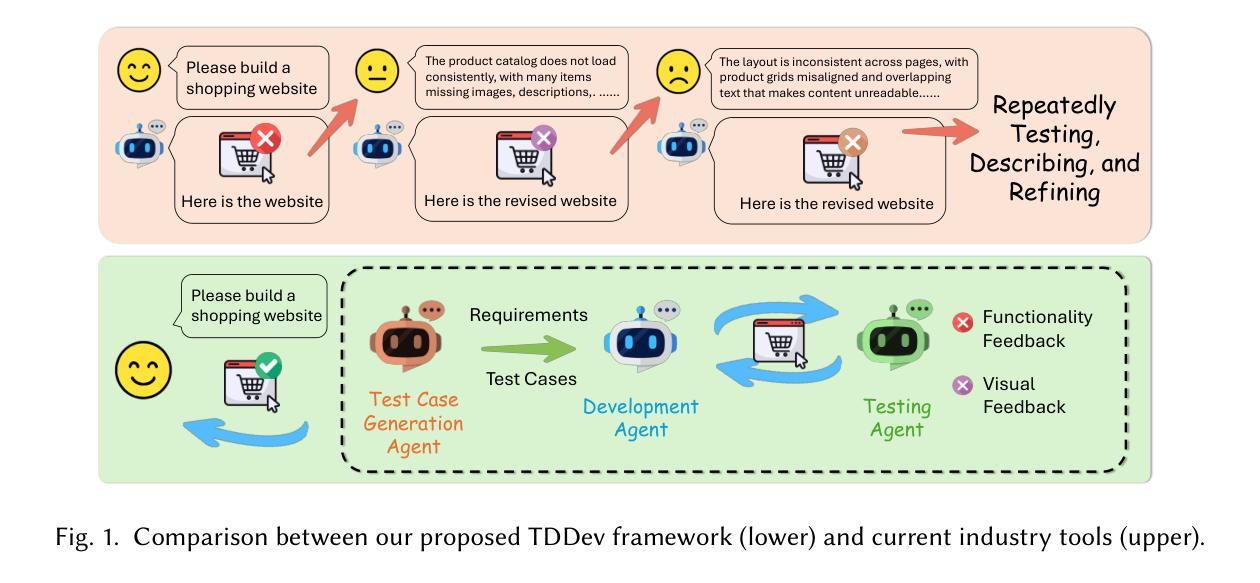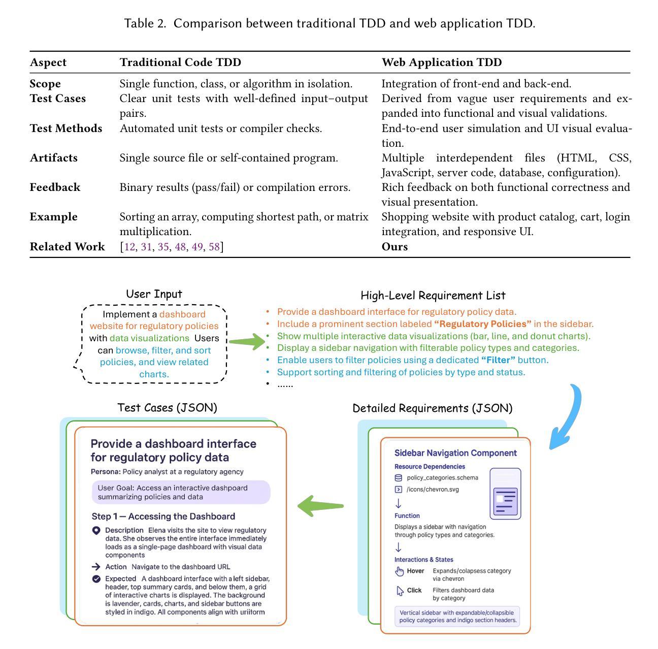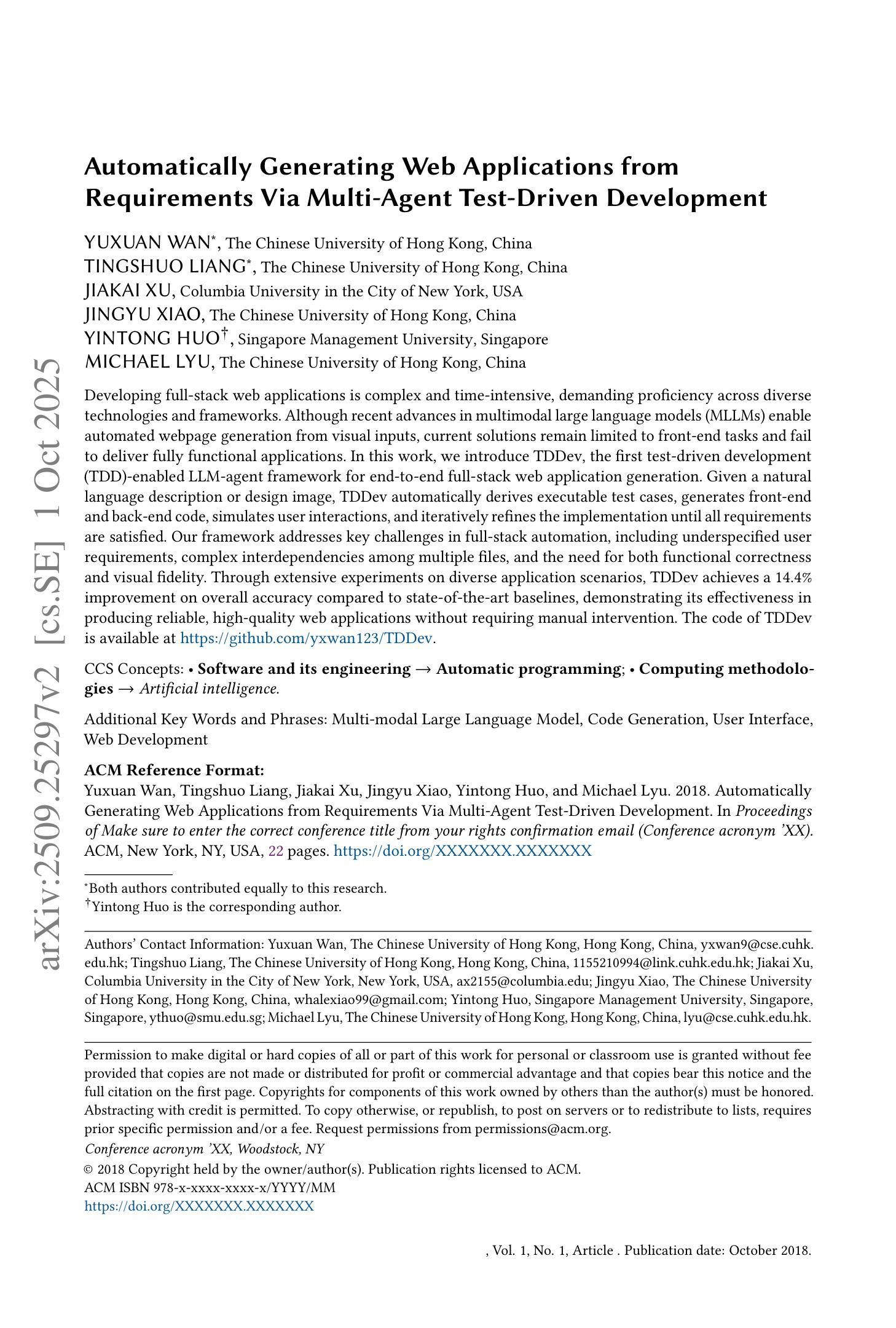 MLLMs赋能自动化网页生成技术,但仍局限于前端任务。本文介绍TDDev框架,采用测试驱动开发(TDD)和LLM代理技术实现全栈Web应用端到端的自动化生成。该框架可根据自然语言描述或设计图像自动生成测试用例,包括前后端代码,模拟用户交互,并在满足所有要求后逐步优化实现。实验结果证明了其在生成可靠高质量Web应用方面的优势。相比当前最新技术基线,TDDev在总体准确性上提升了高达百分之十四点四的准确度,提高了无人工干预的自适应能力。同时能很好地处理用户要求不明确等难题,是跨领域技术创新的重要组成部分。综合试验显示了其显著的优势和潜力。