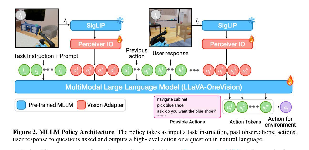 在家庭环境中操作的实体代理需要解释模糊和未指定的人类指令。为了准确推断用户意图并更有效地执行任务,家用机器人应该能够识别指令的模糊性并询问相关的澄清问题。为此,我们引入了“问行任务”(Ask-to-Act task),并在此任务中研究实体代理如何在使用未指定指令进行单对象或多对象重新布置时解决模糊性和导航问题。我们提出了一种新颖的方法,通过在线强化学习微调多模态大型语言模型(MLLMs),将其作为视觉语言行动(VLA)策略。我们的方法消除了对大规模人类演示或手动工程奖励的需求。在基准测试中,我们的RL微调MLLM显著优于包括GPT-4o在内的零样本基线,并具有良好的泛化能力。据我们所知,这是首次展示将MLLMs适应为VLA代理,可以使用LLM生成的奖励进行在线RL行动和寻求帮助。