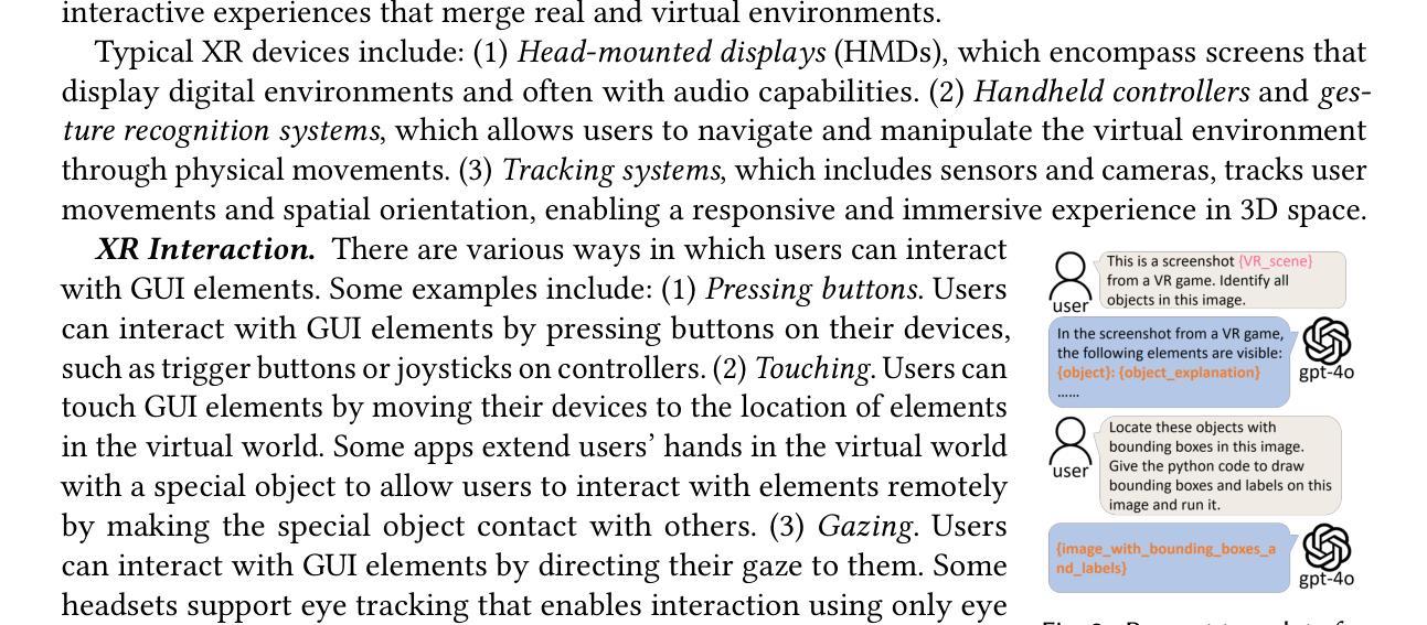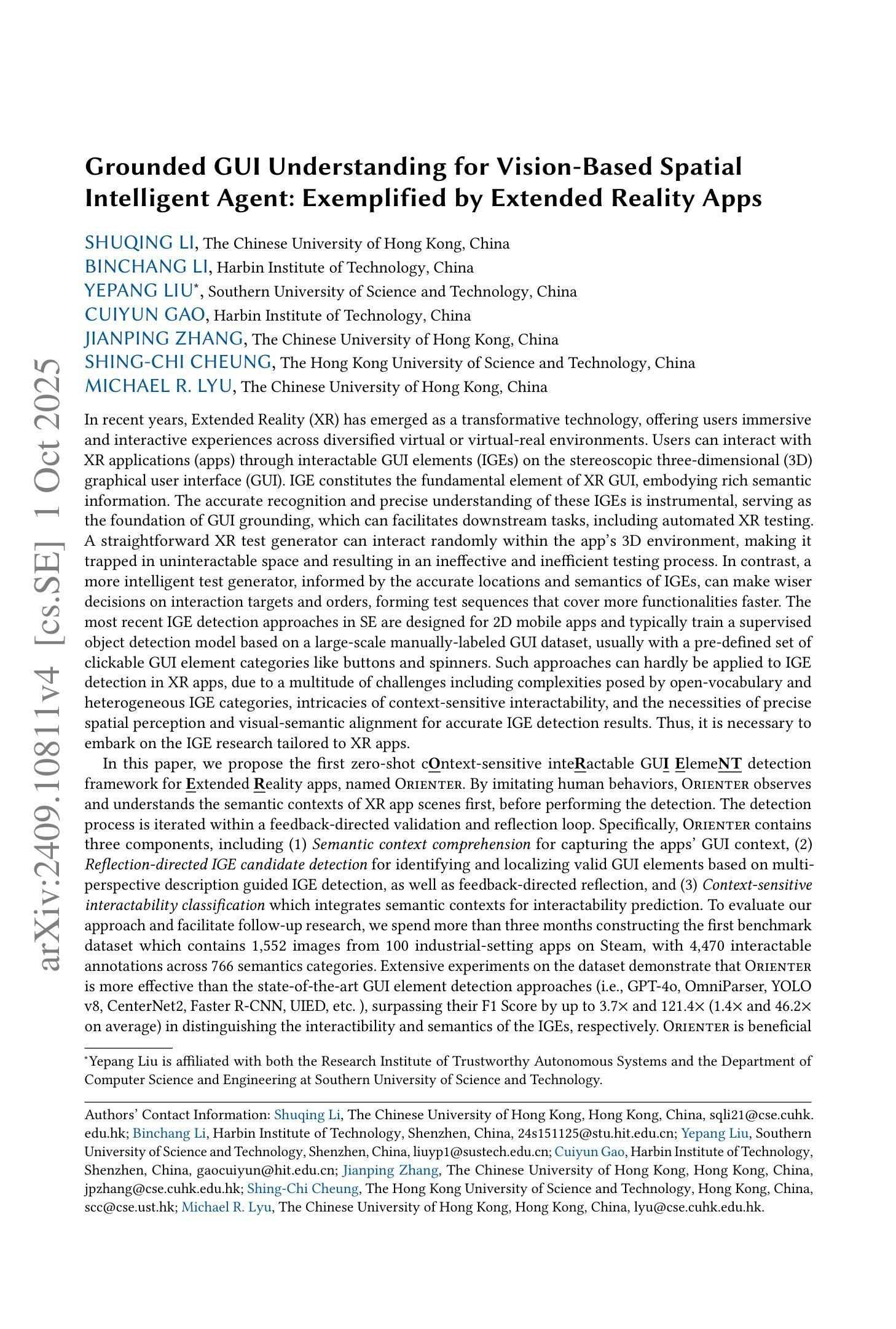 该文本介绍了空间计算(Extended Reality,XR)技术及其在虚拟环境中的沉浸式互动体验应用。用户可以通过立体三维图形用户界面(GUI)上的可交互GUI元素(IGEs)与XR应用程序进行交互。准确的IGE识别对于包括自动化测试和有效的GUI搜索在内的许多软件工程任务至关重要。然而,现有的IGE检测方法难以应用于XR应用程序中的IGE检测,面临开放词汇、异质IGE类别、上下文敏感交互性等多方面的挑战。因此,本文提出了一种名为Orienter的零样本上下文敏感交互式GUI元素检测框架,通过模仿人类行为来观察和理解XR应用程序场景的语义上下文,进行IGE检测,并通过反馈导向的验证和反思循环进行迭代优化。实验证明,Orienter比现有的GUI元素检测方法更有效。