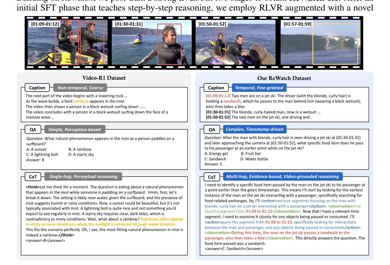 While Reinforcement Learning with Verifiable Reward (RLVR) significantly advances image reasoning in Large Vision-Language Models (LVLMs), its application to complex video reasoning remains underdeveloped. This gap stems primarily from a critical data bottleneck: existing datasets lack the challenging, multi-hop questions and high-quality, video-grounded Chain-of-Thought (CoT) data necessary to effectively bootstrap RLVR. To address this, we introduce ReWatch, a large-scale dataset built to foster advanced video reasoning. We propose a novel multi-stage synthesis pipeline to synthesize its three components: ReWatch-Caption, ReWatch-QA, and ReWatch-CoT. A core innovation is our Multi-Agent ReAct framework for CoT synthesis, which simulates a human-like “re-watching” process to generate video-grounded reasoning traces by explicitly modeling information retrieval and verification. Building on this dataset, we develop ReWatch-R1 by post-training a strong baseline LVLM with Supervised Fine-Tuning (SFT) and our RLVR framework. This framework incorporates a novel Observation & Reasoning (O&R) reward mechanism that evaluates both the final answer’s correctness and the reasoning’s alignment with video content, directly penalizing hallucination. Our experiments show that ReWatch-R1 achieves state-of-the-art average performance on five challenging video reasoning benchmarks. Project Page: https://rewatch-r1.github.io